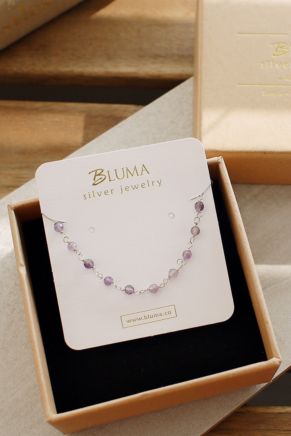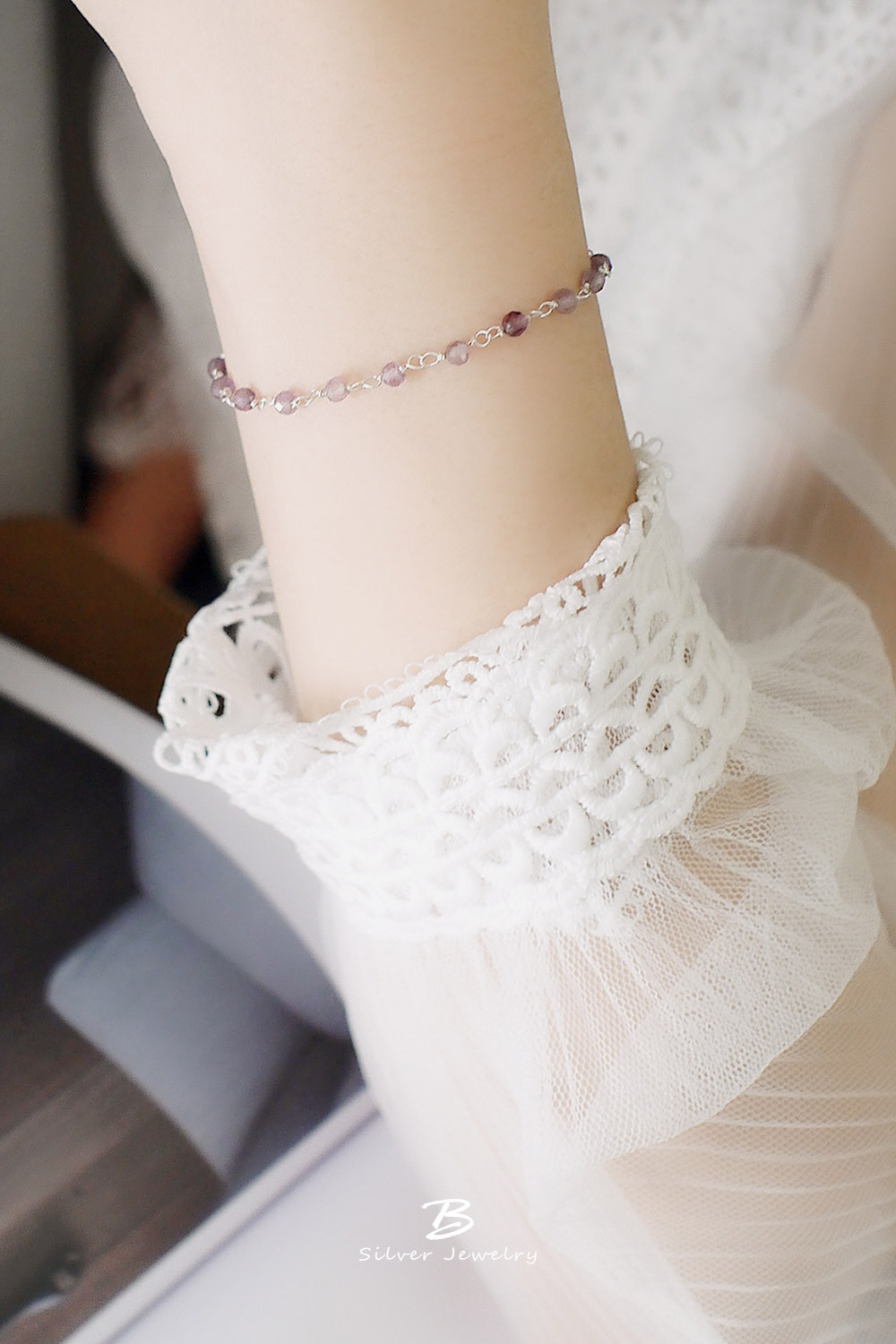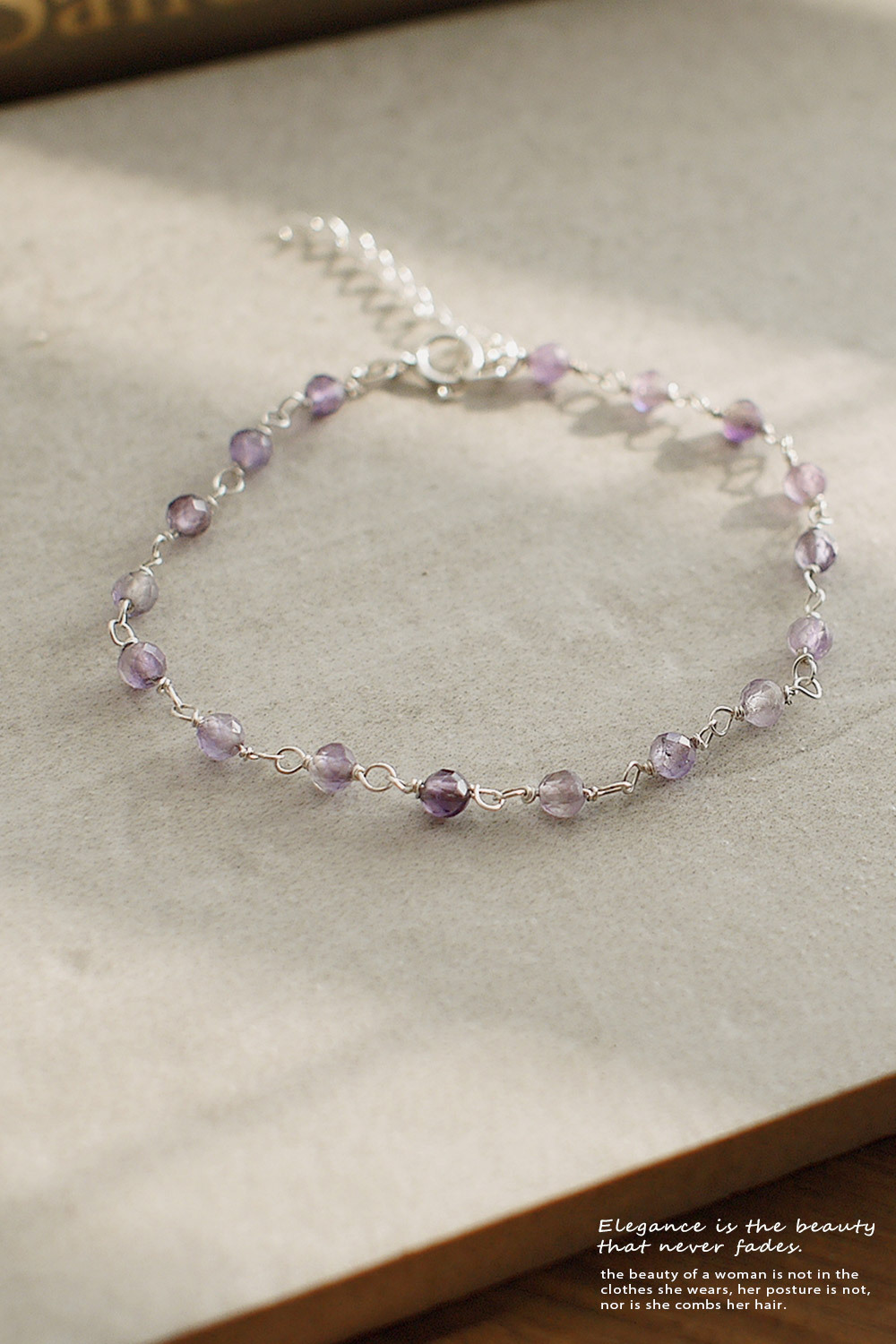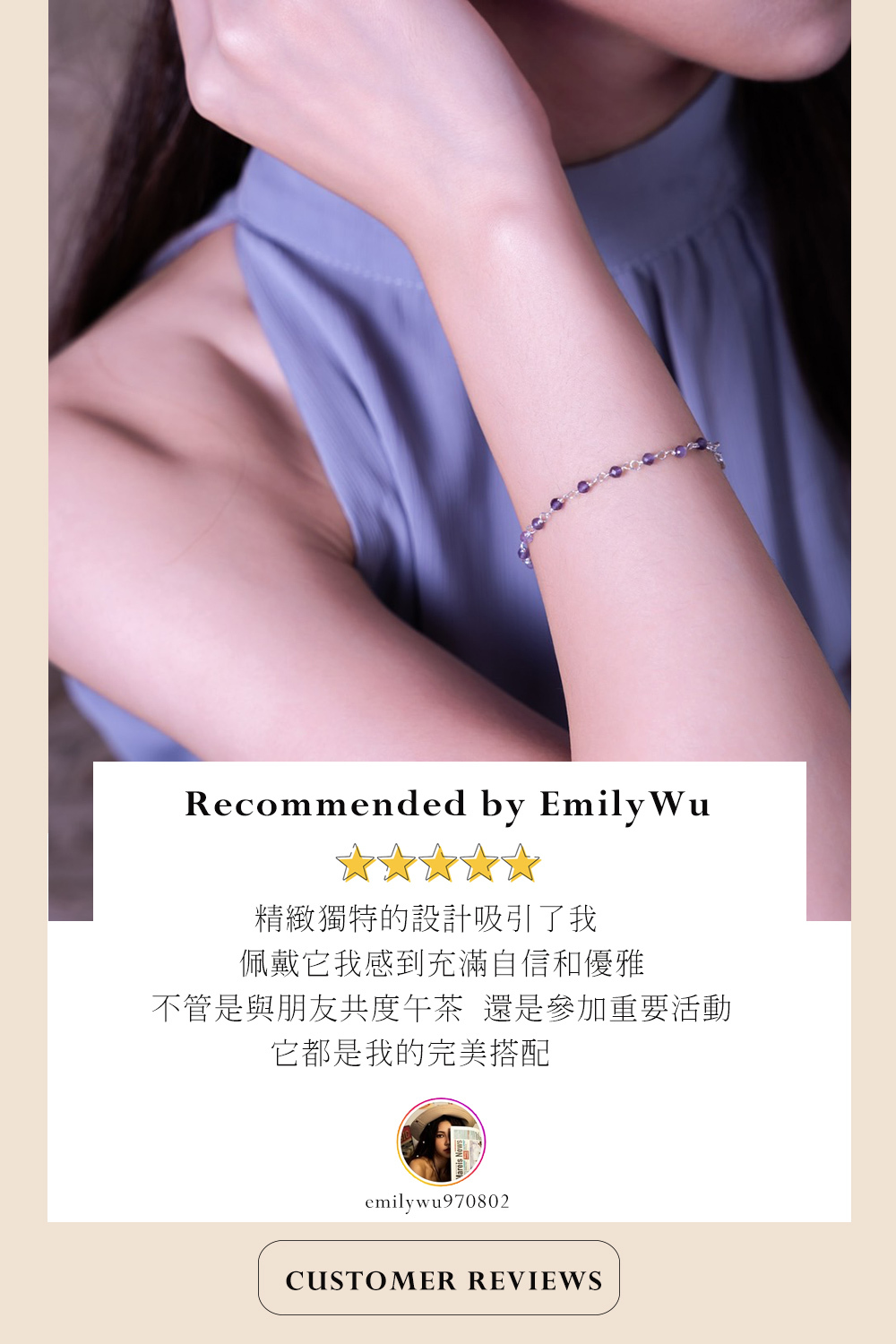 天然紫水晶每顆顏色有深淺之別,以18顆小顆紫水晶串成,色彩有層次感,表面帶有自然雲霧或冰裂紋,質感高雅不單調。