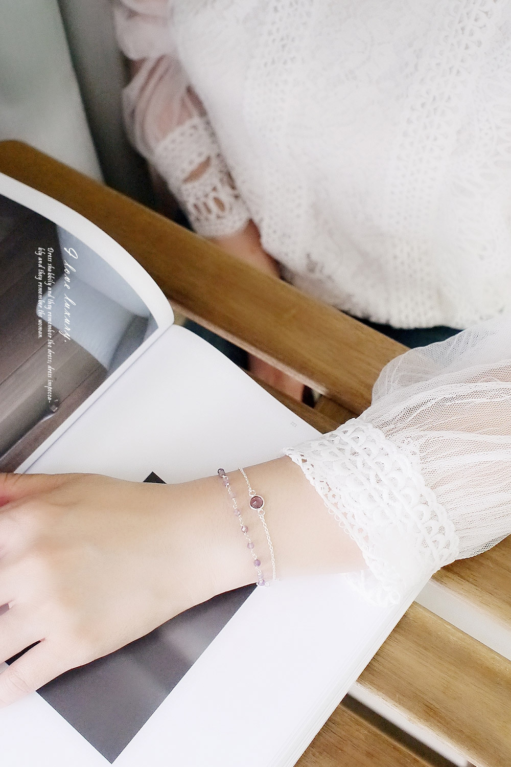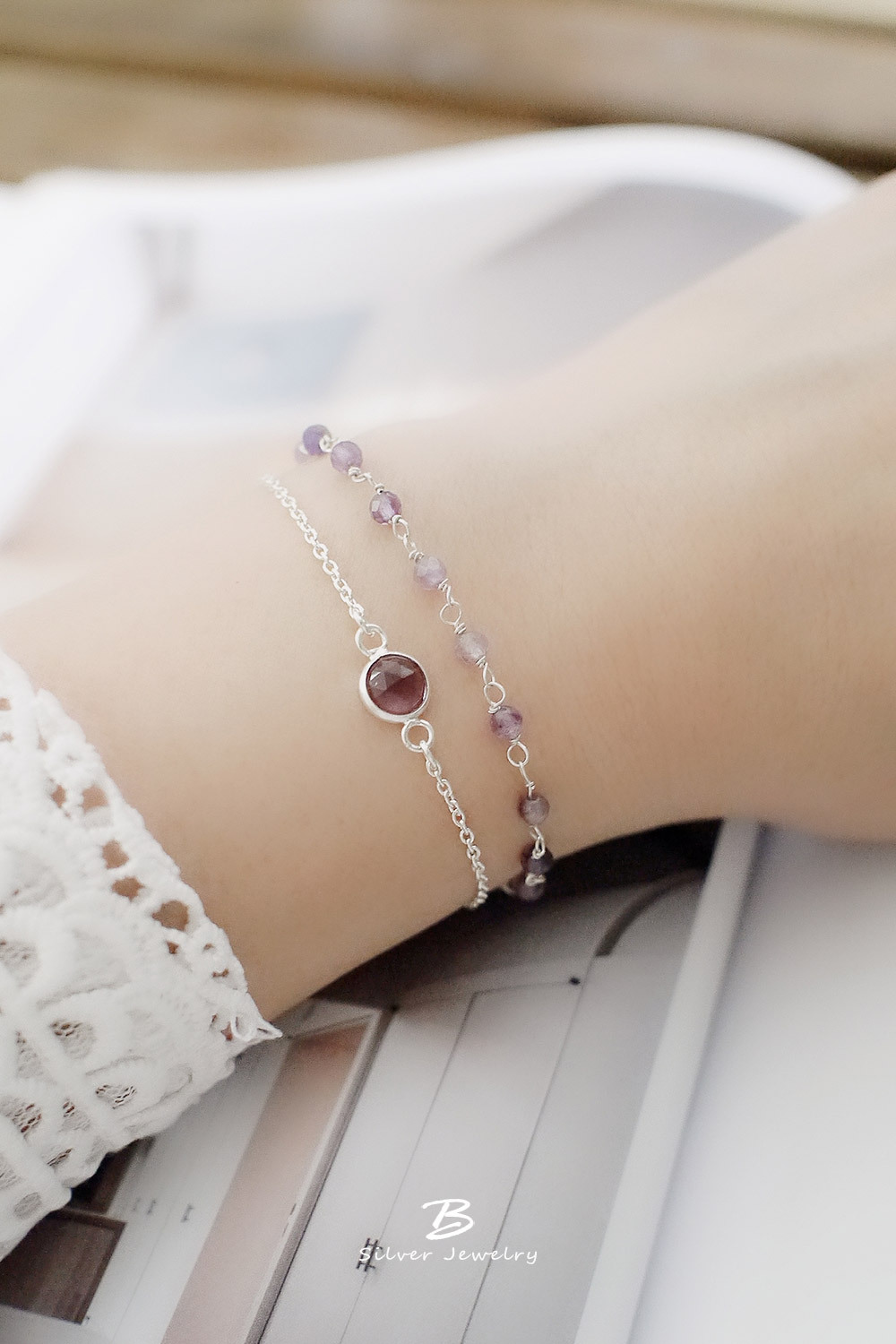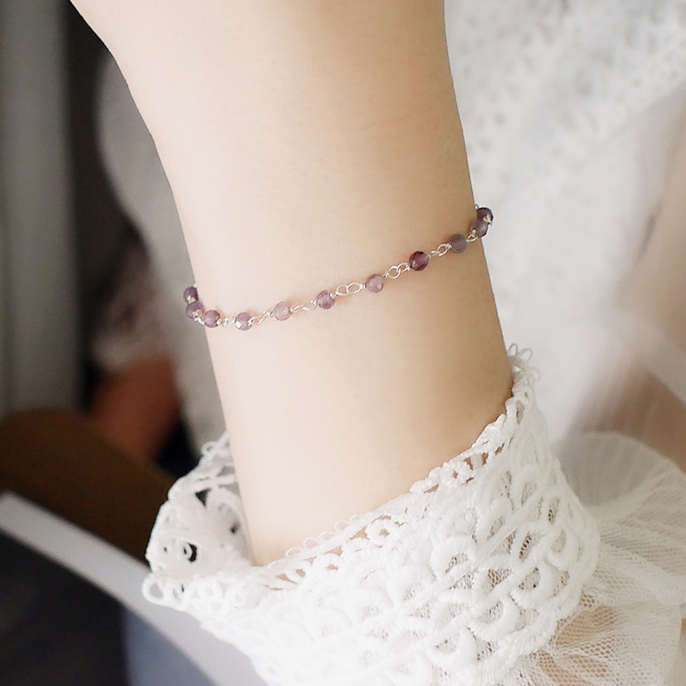 天然紫水晶每顆顏色有深淺之別,以18顆小顆紫水晶串成,色彩有層次感,表面帶有自然雲霧或冰裂紋,質感高雅不單調。