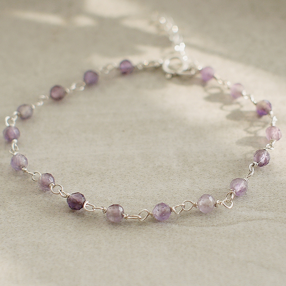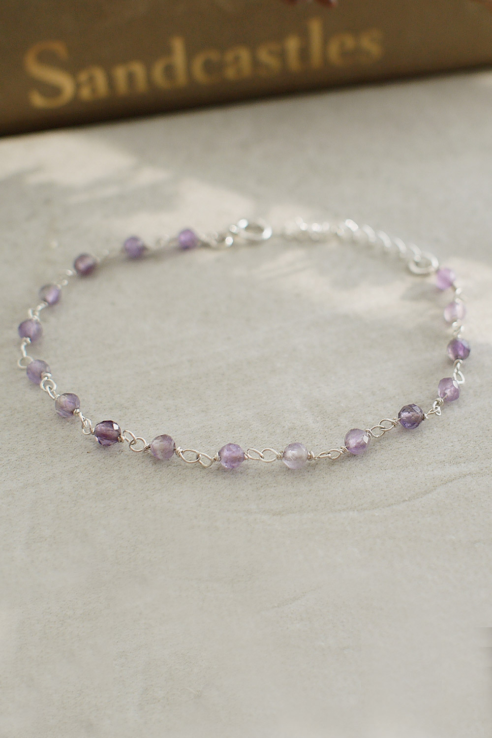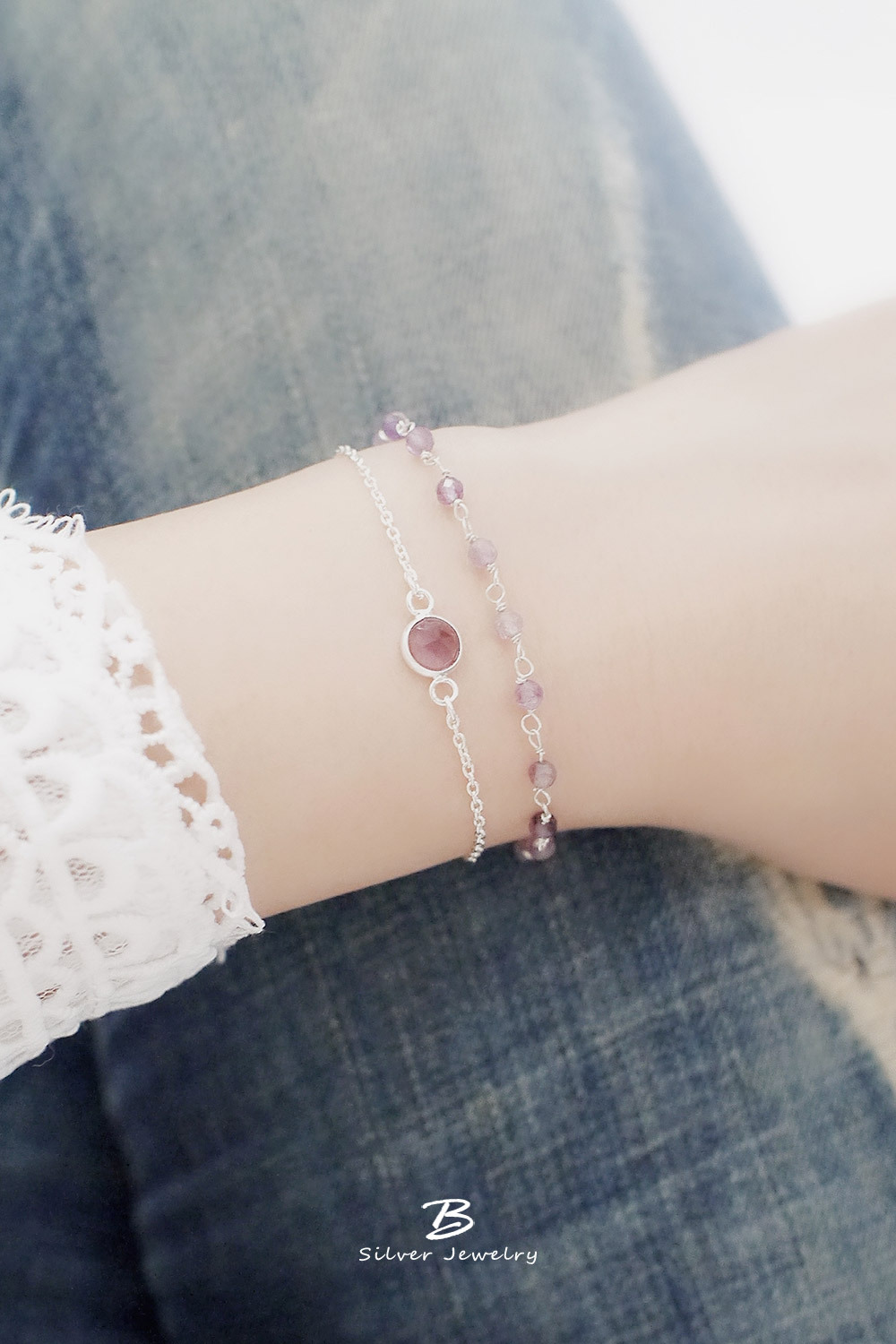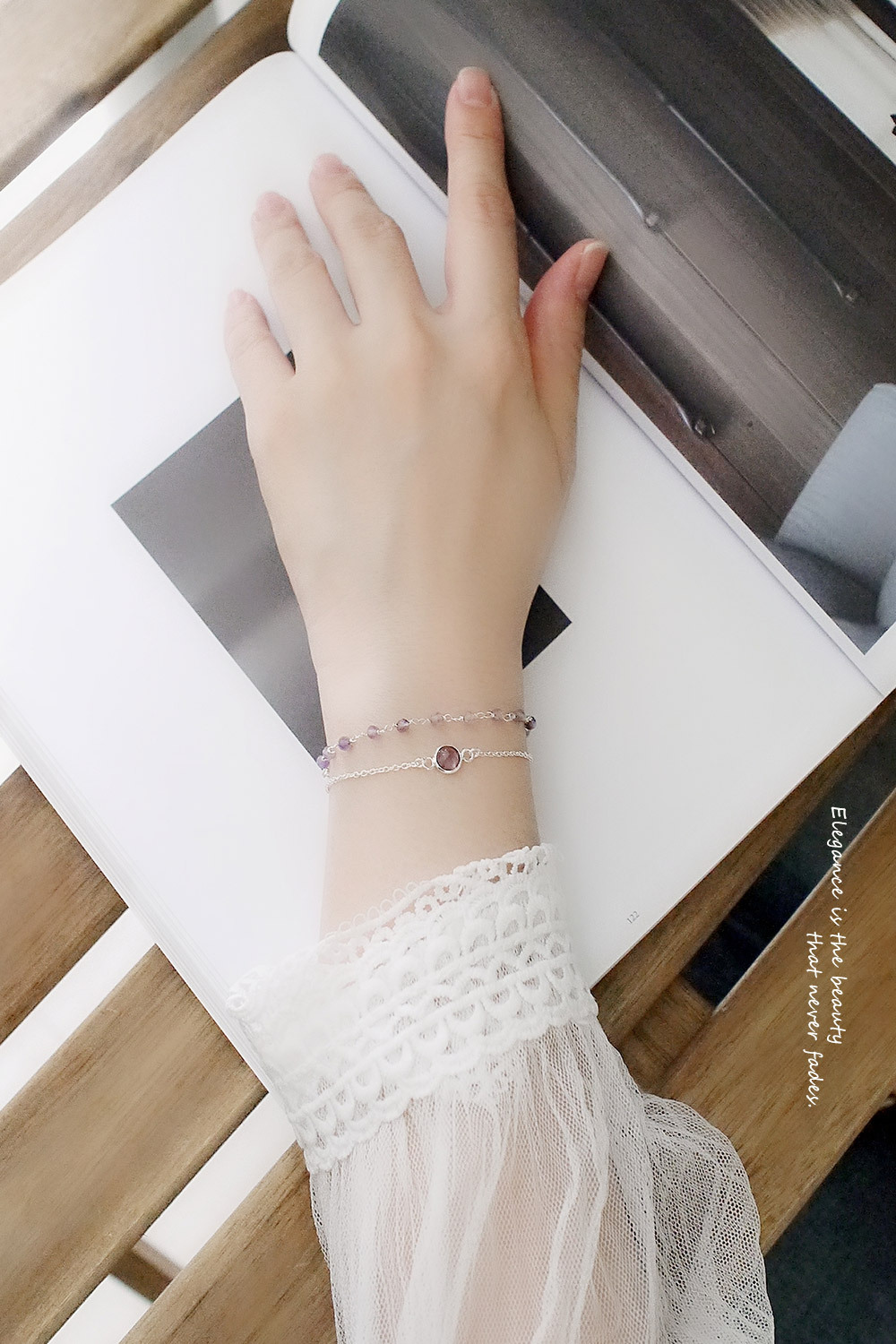 天然紫水晶每顆顏色有深淺之別,以18顆小顆紫水晶串成,色彩有層次感,表面帶有自然雲霧或冰裂紋,質感高雅不單調。