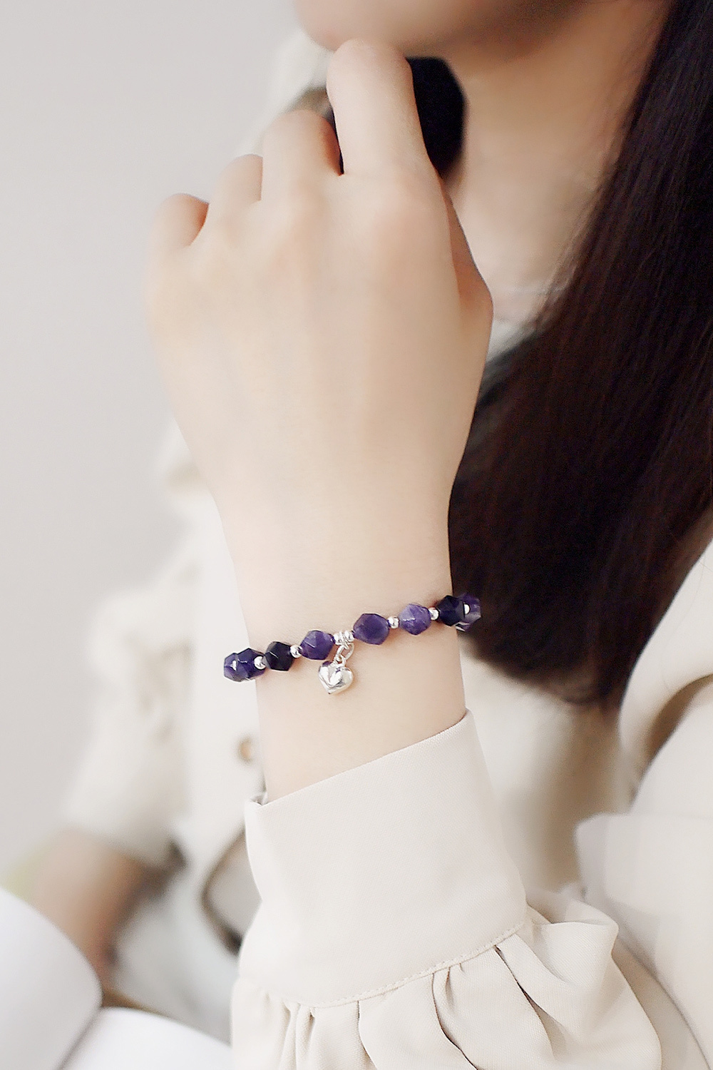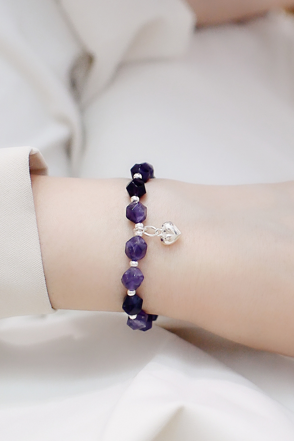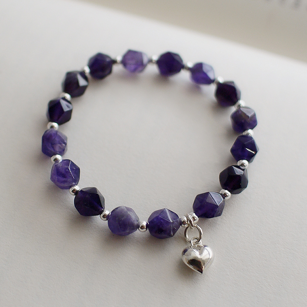 切面水晶搭配925純銀珠,搭上愛心吊墜,戴起來優雅又不失個性