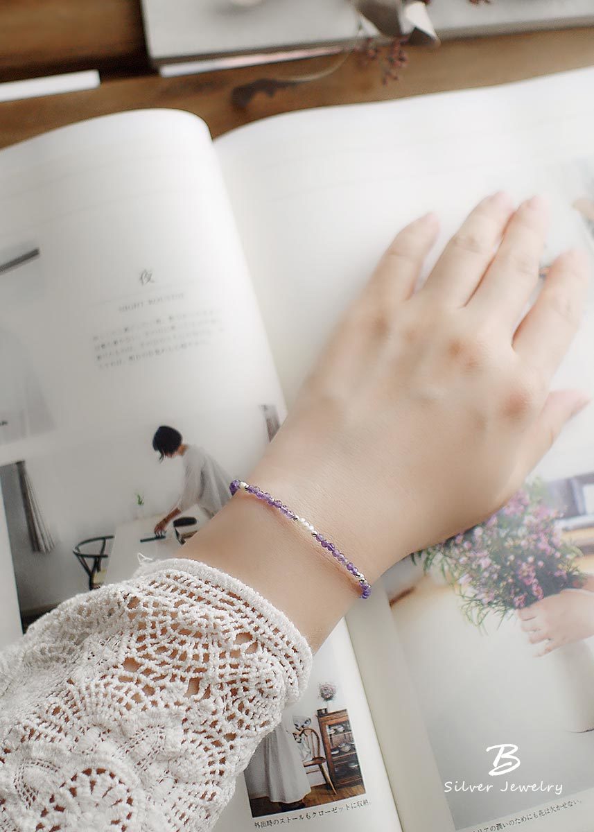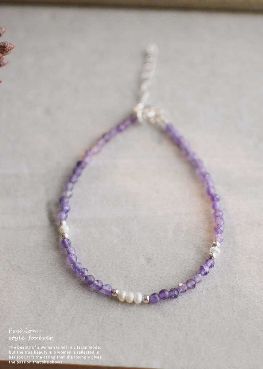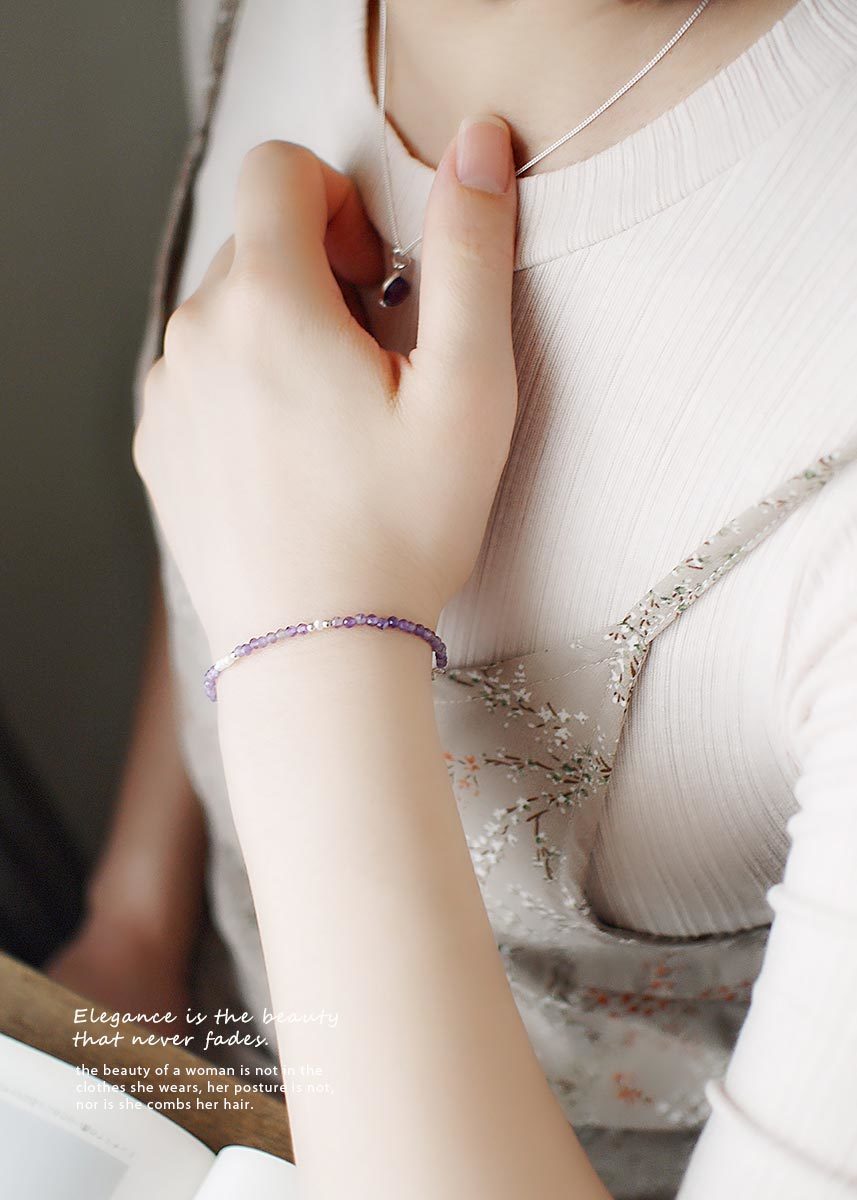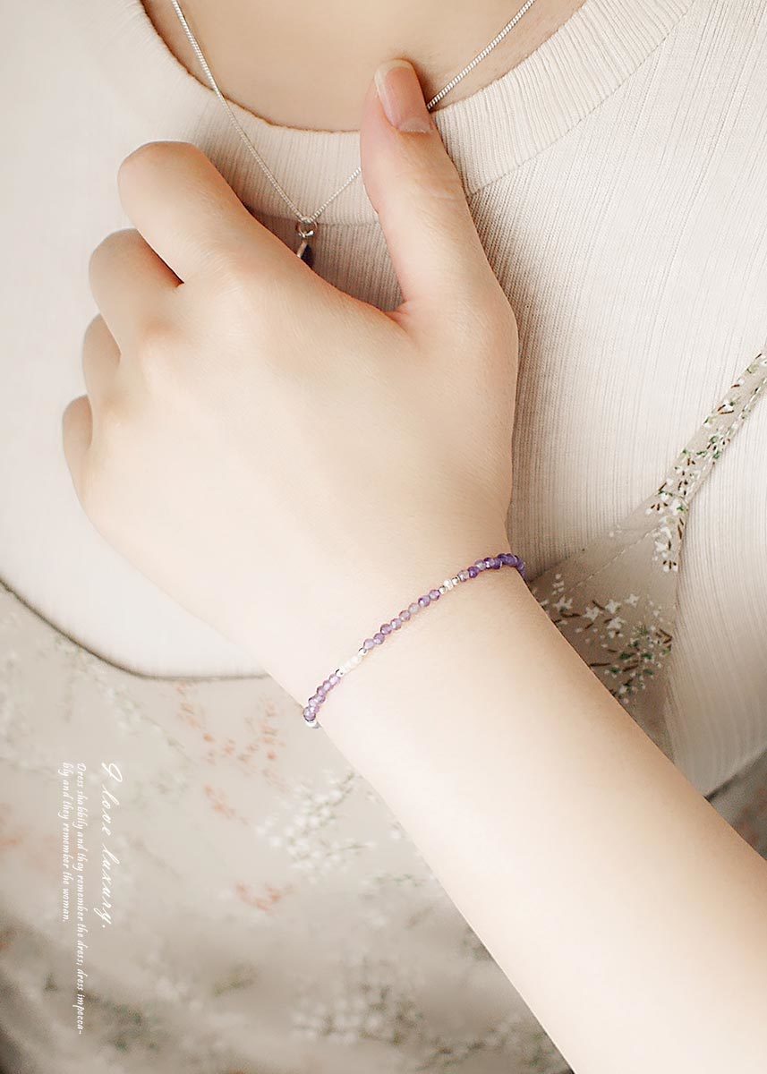 天然紫水晶每顆顏色有深淺之別,因此組合而成的手鍊有層次感,表面帶有自然雲霧或冰裂紋,質感高雅不單調。