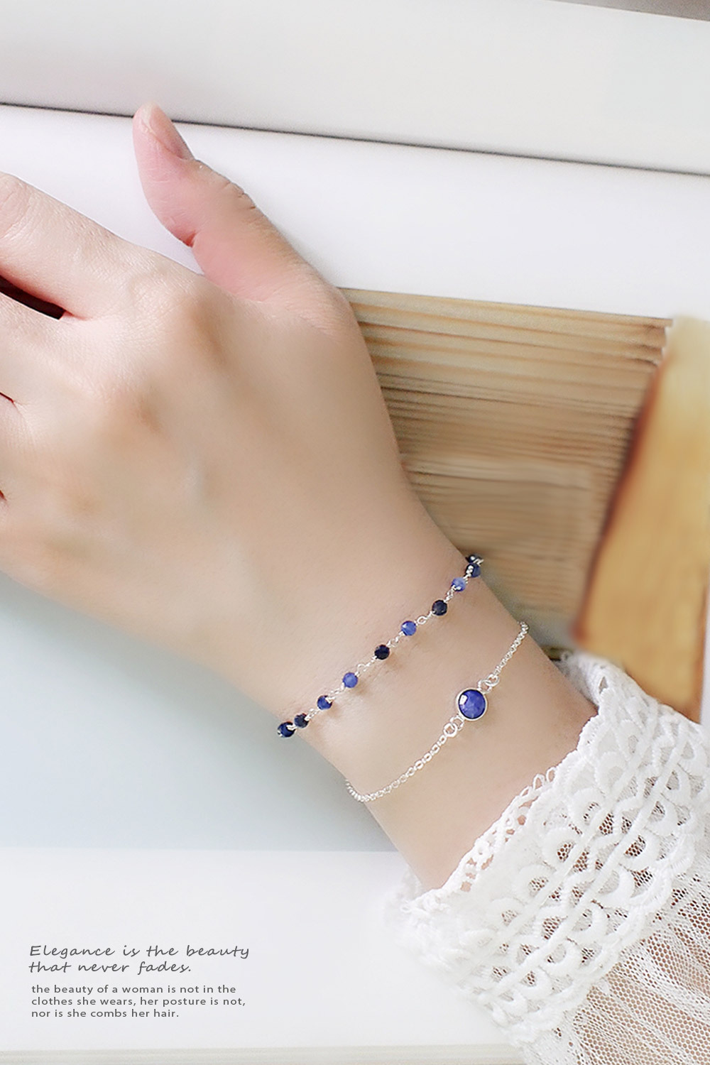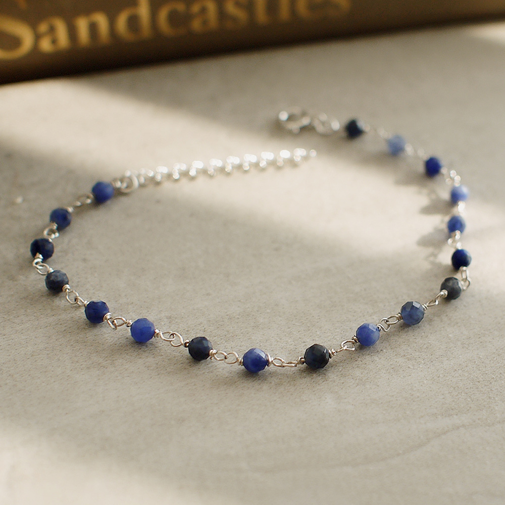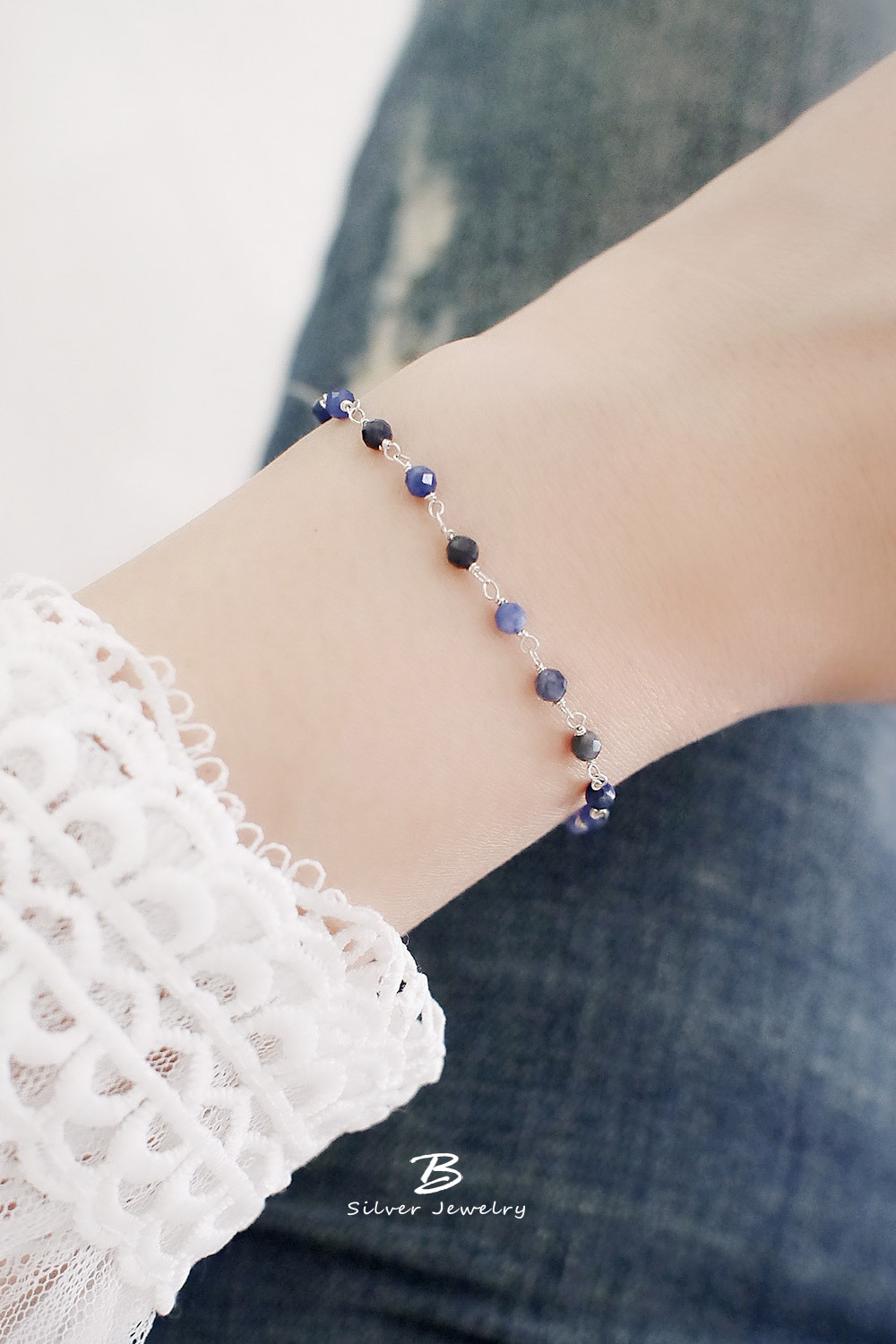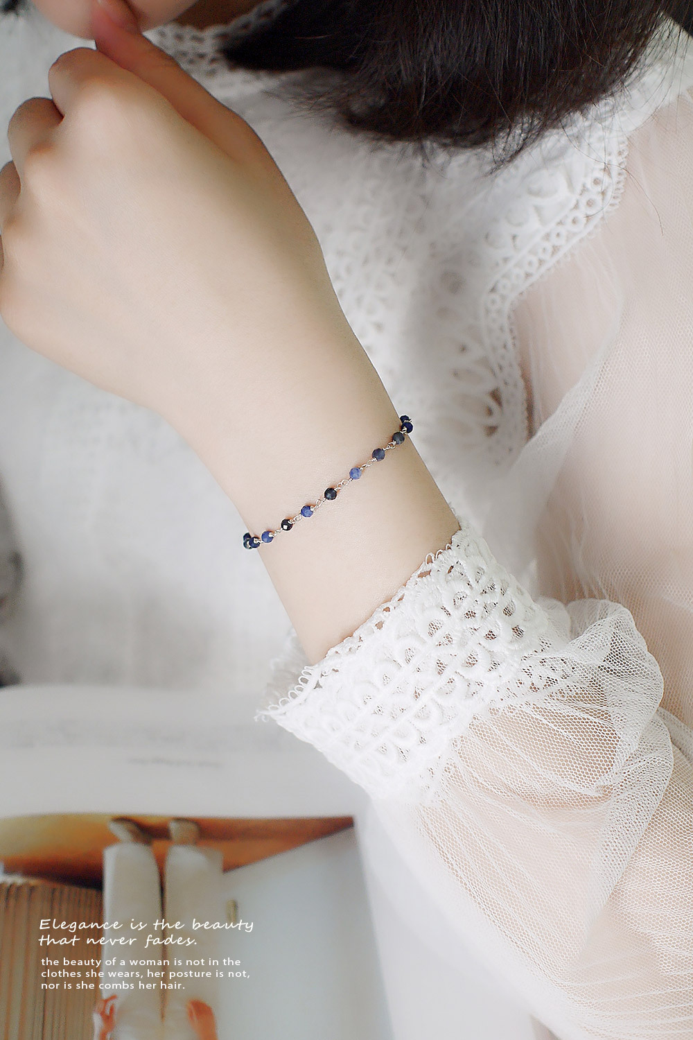 以18顆小顆藍寶石串成,天然材質,每顆寶石顏色深淺不同,色彩有層次,展現高雅美感。