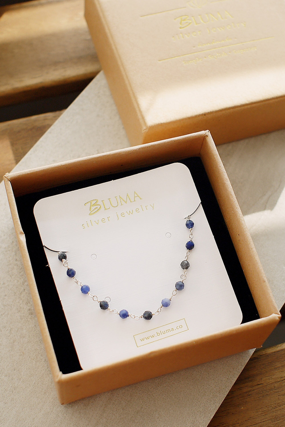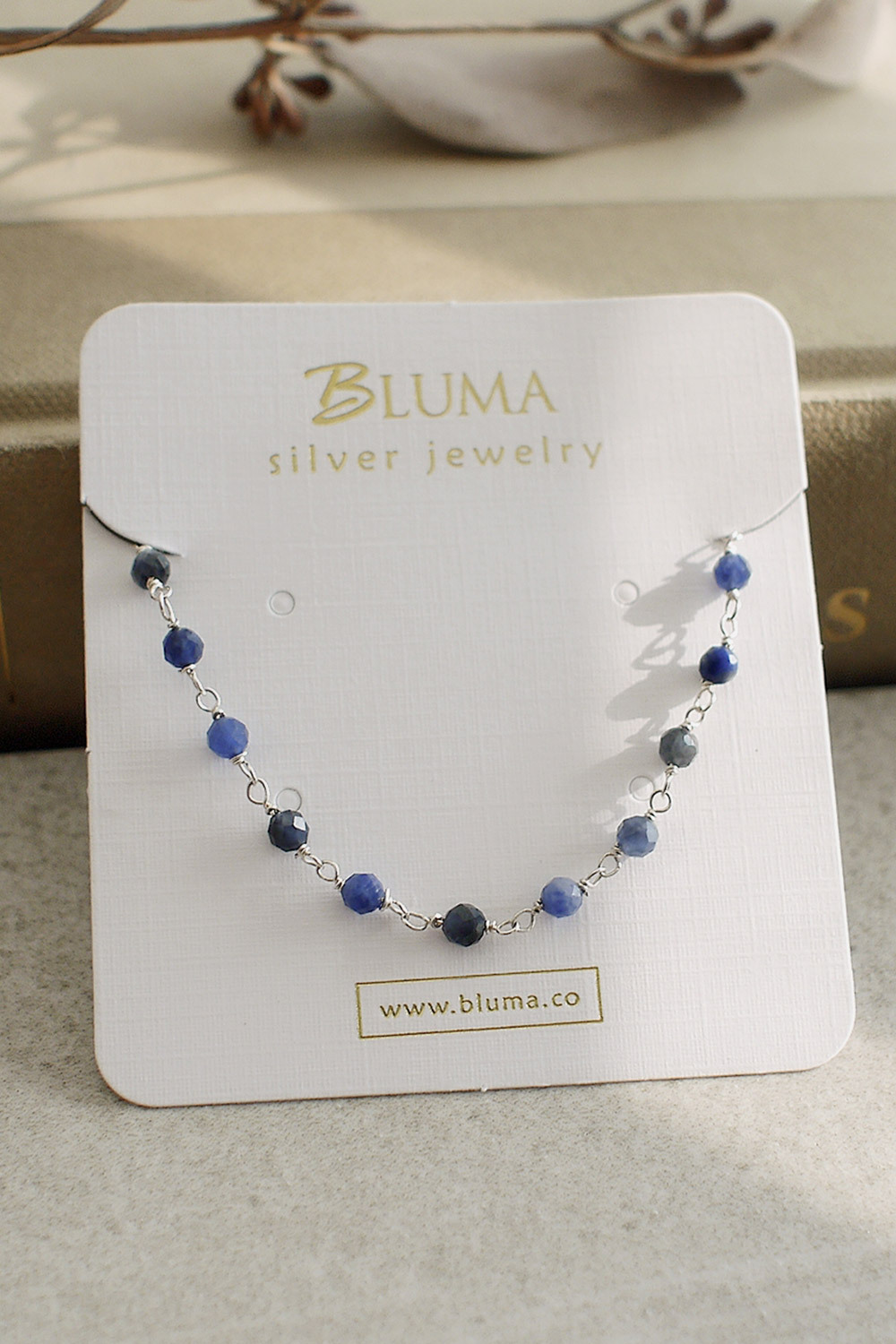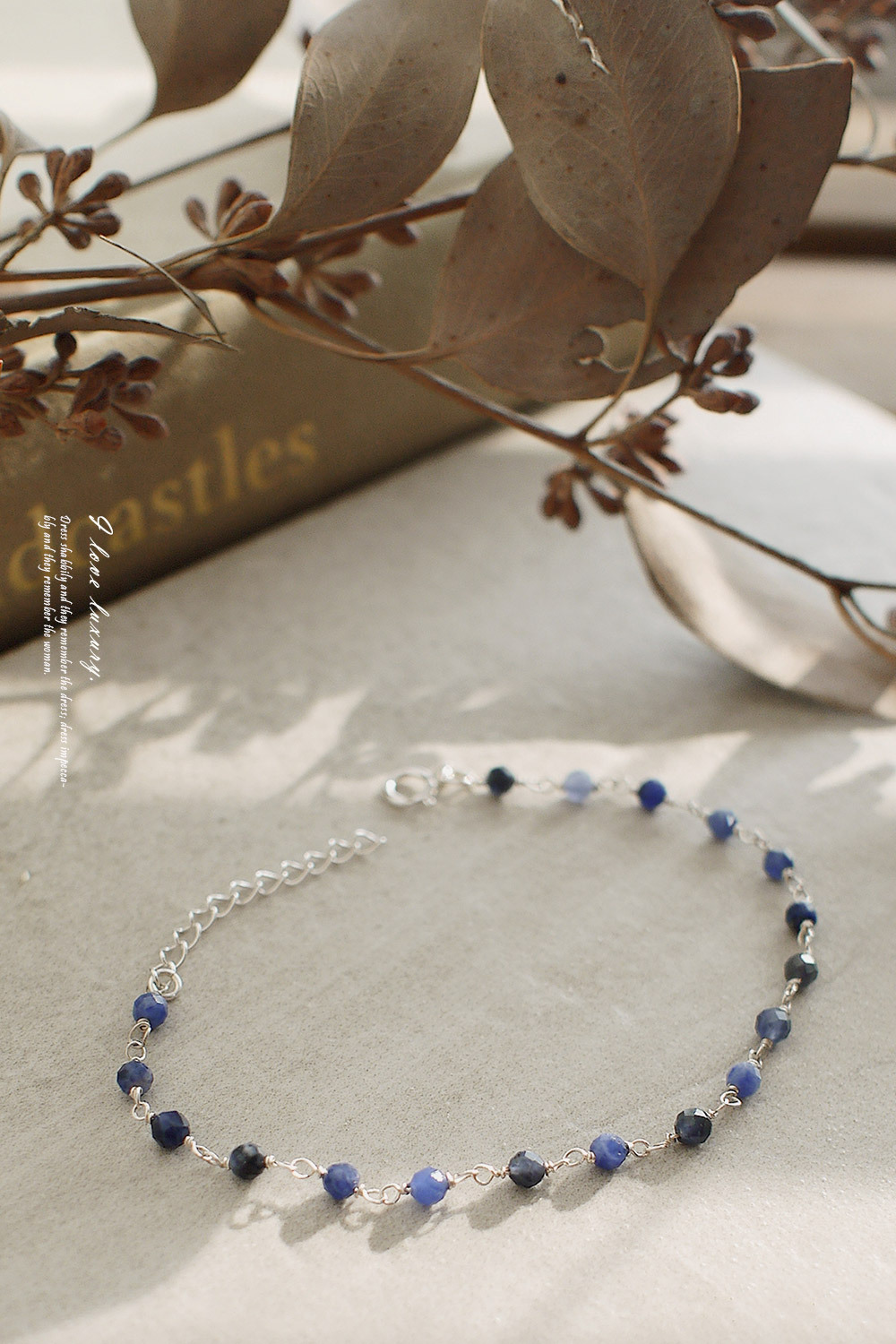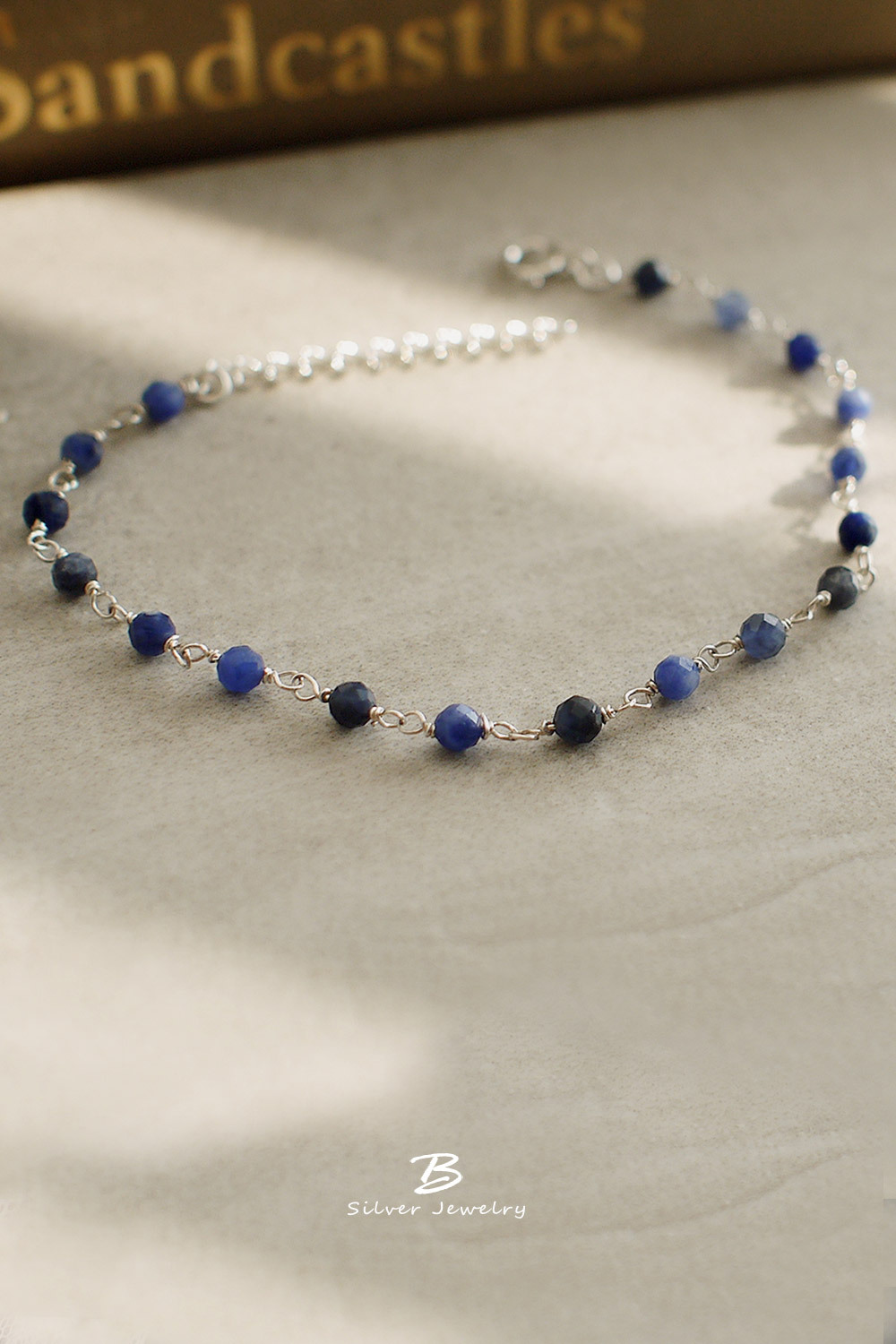 以18顆小顆藍寶石串成,天然材質,每顆寶石顏色深淺不同,色彩有層次,展現高雅美感。
