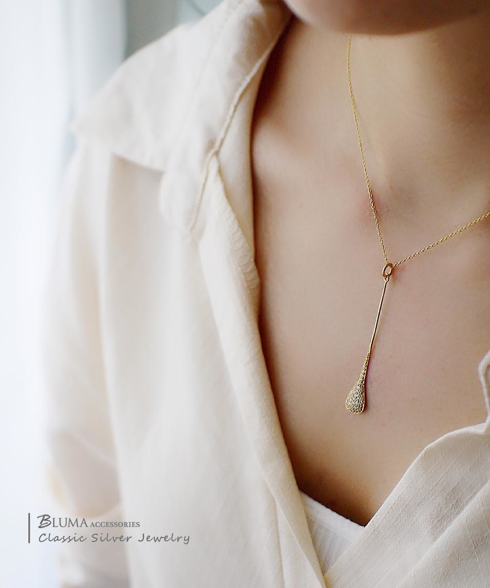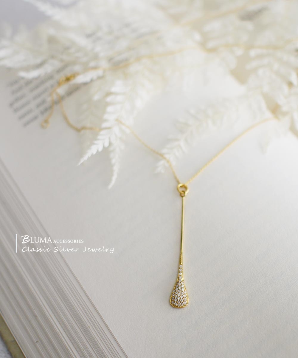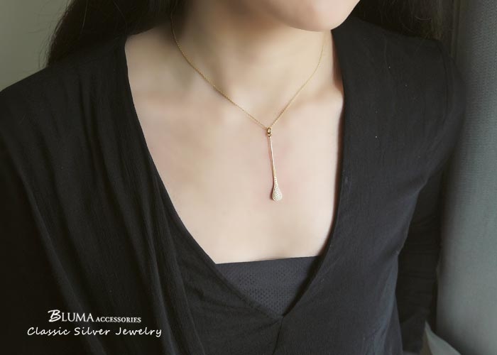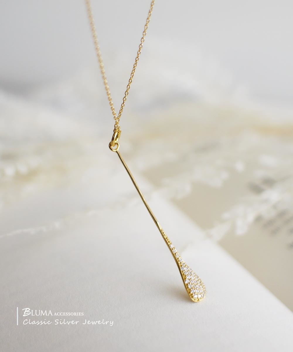 典雅精緻的純銀鍍18K金項鍊,細長型的墜子,輪廓高雅,凸顯女性的自信與女人味。