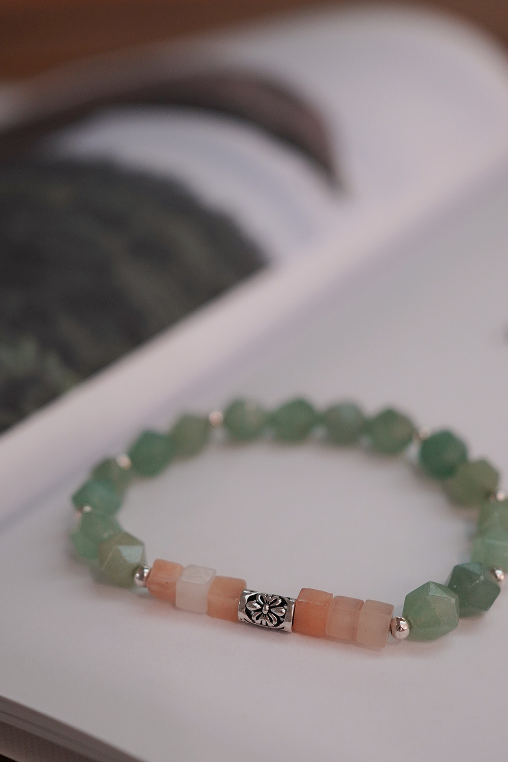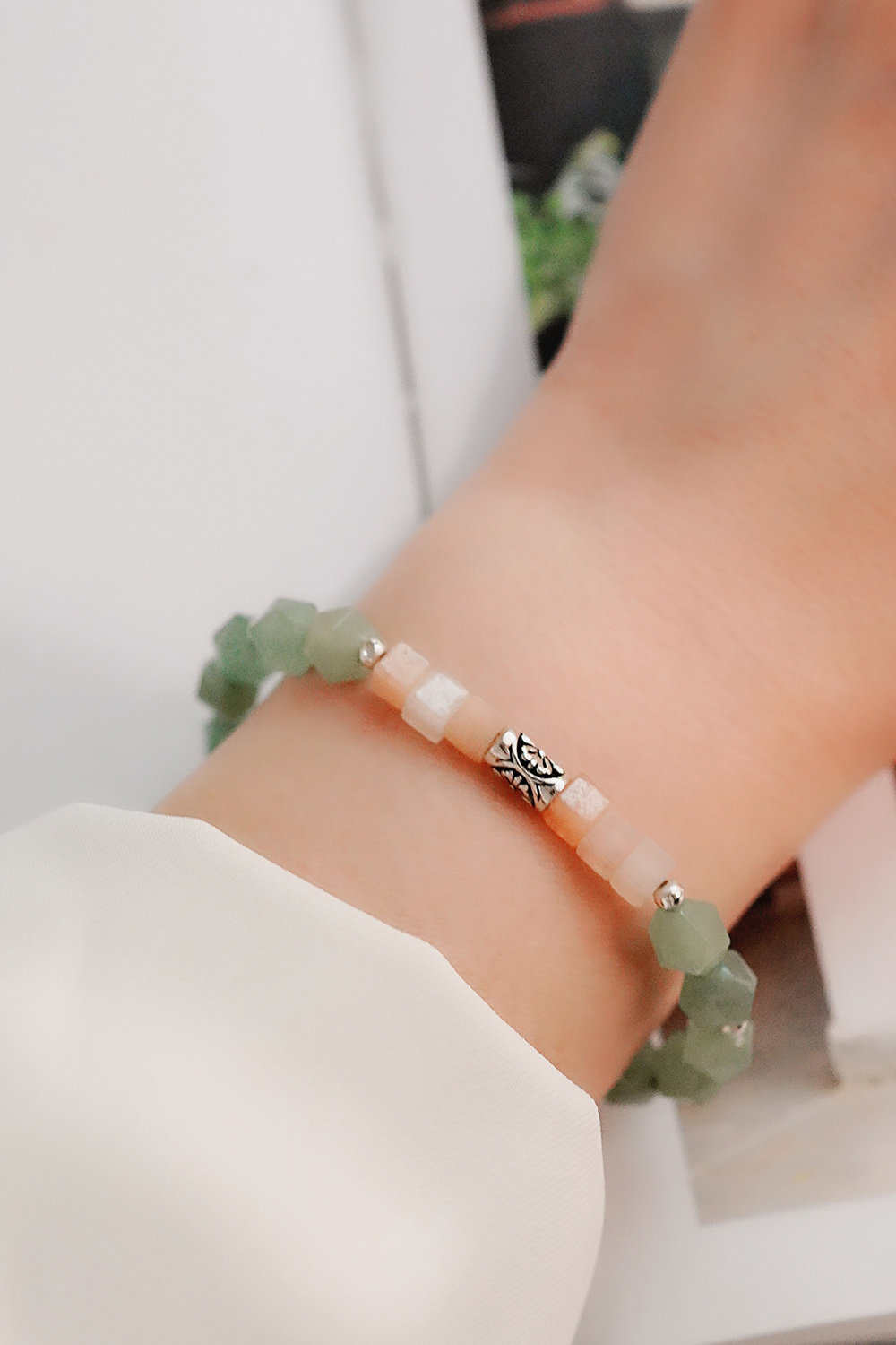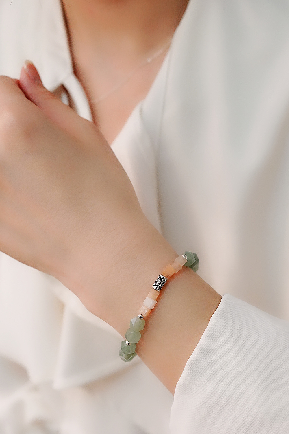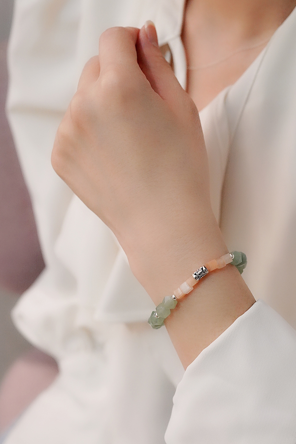 「晨曦」925純銀手鍊,以小方塊切面的粉紅東菱玉搭配 8mm切面綠東菱玉,交織出如清晨光線般的清新層次。
