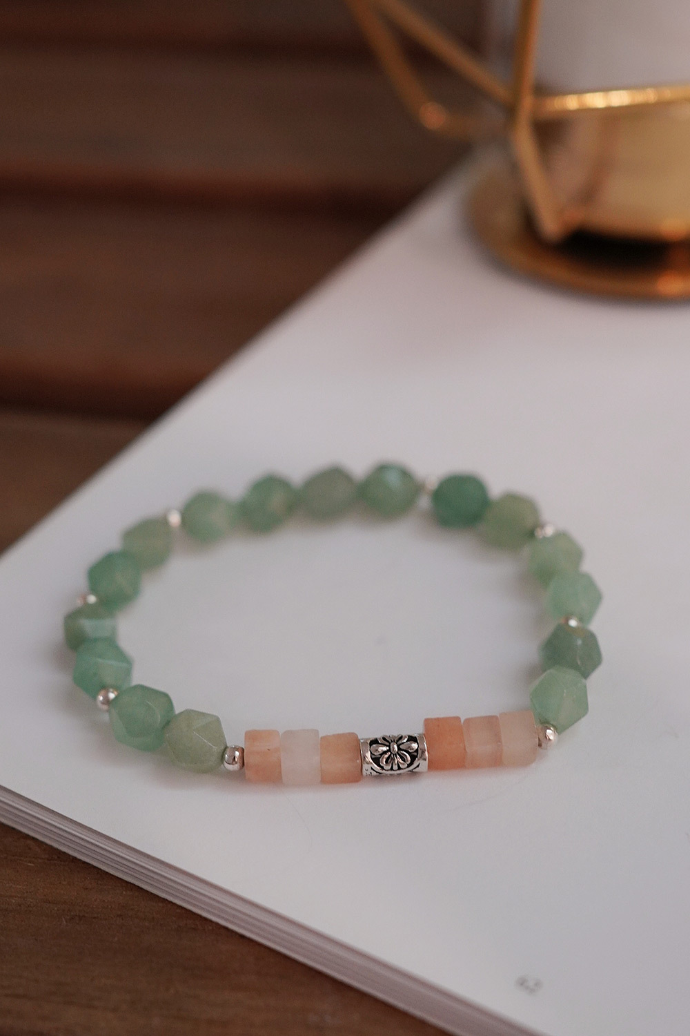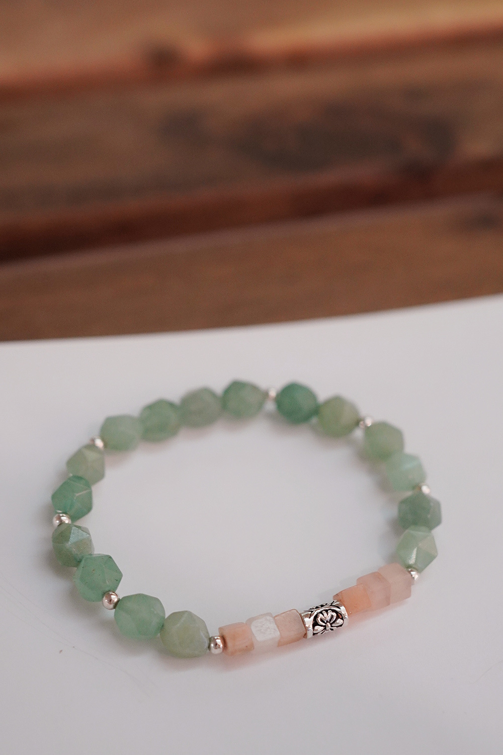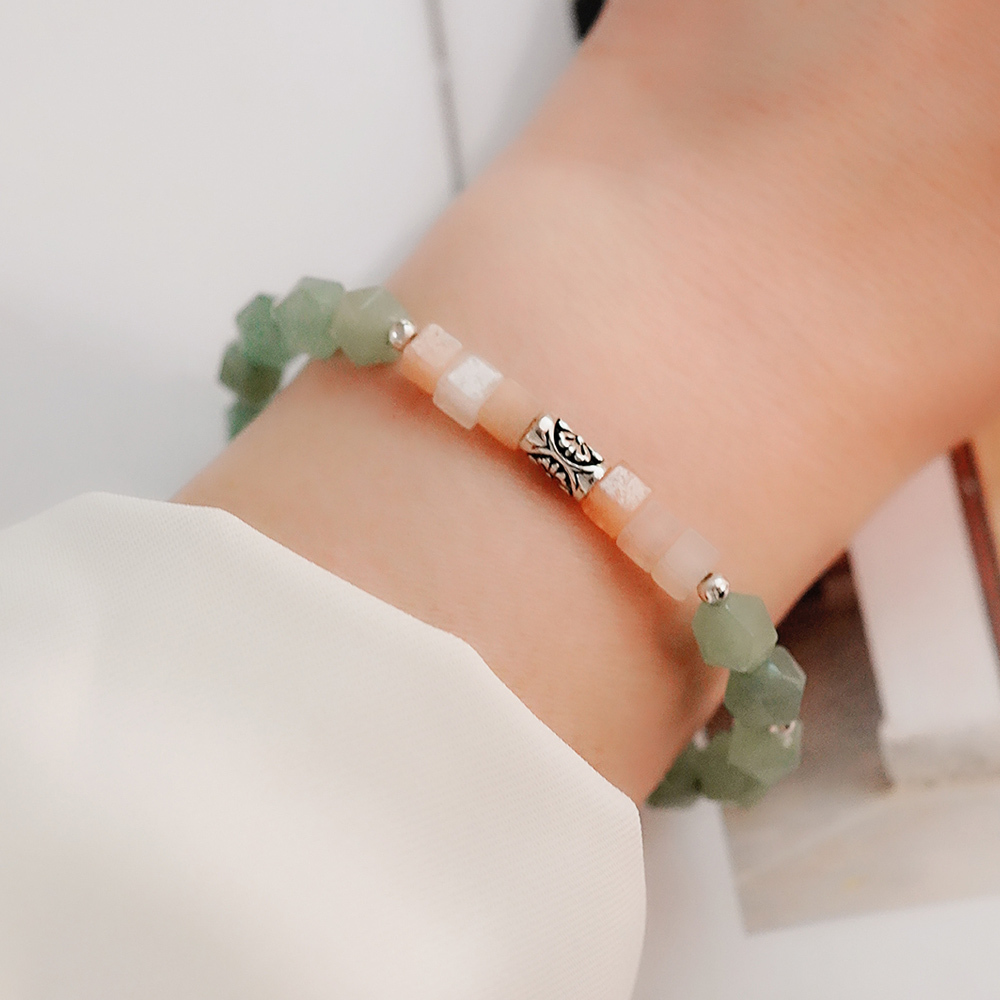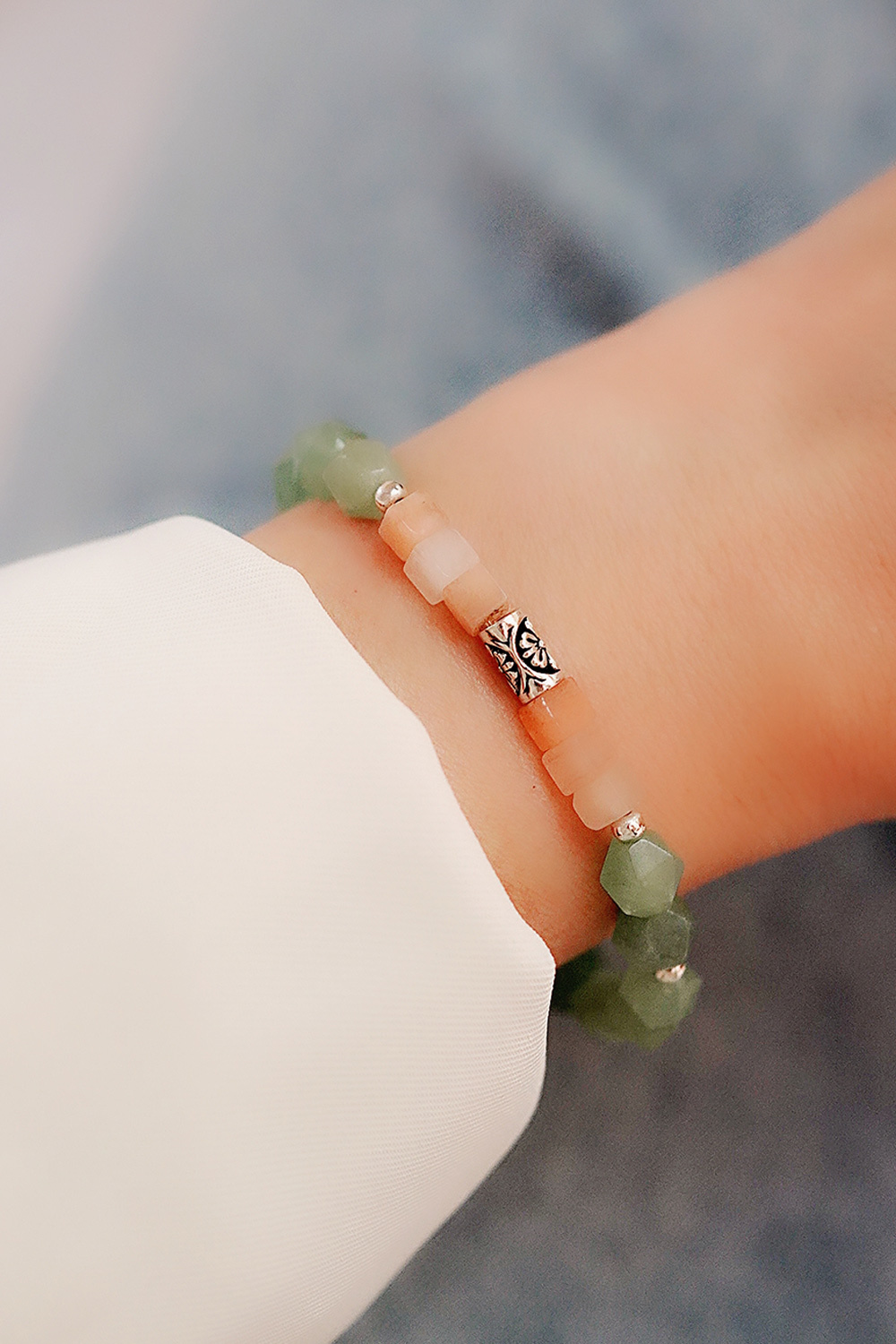 「晨曦」925純銀手鍊,以小方塊切面的粉紅東菱玉搭配 8mm切面綠東菱玉,交織出如清晨光線般的清新層次。