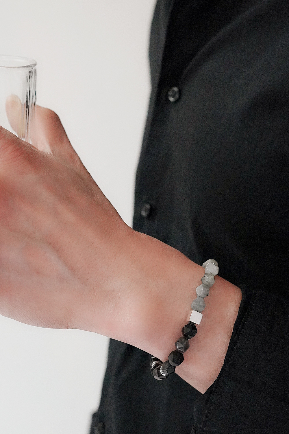 「霧影」以一半拉長石、一半銀曜石交織成雙色設計,低調卻一眼有感的獨家款式。