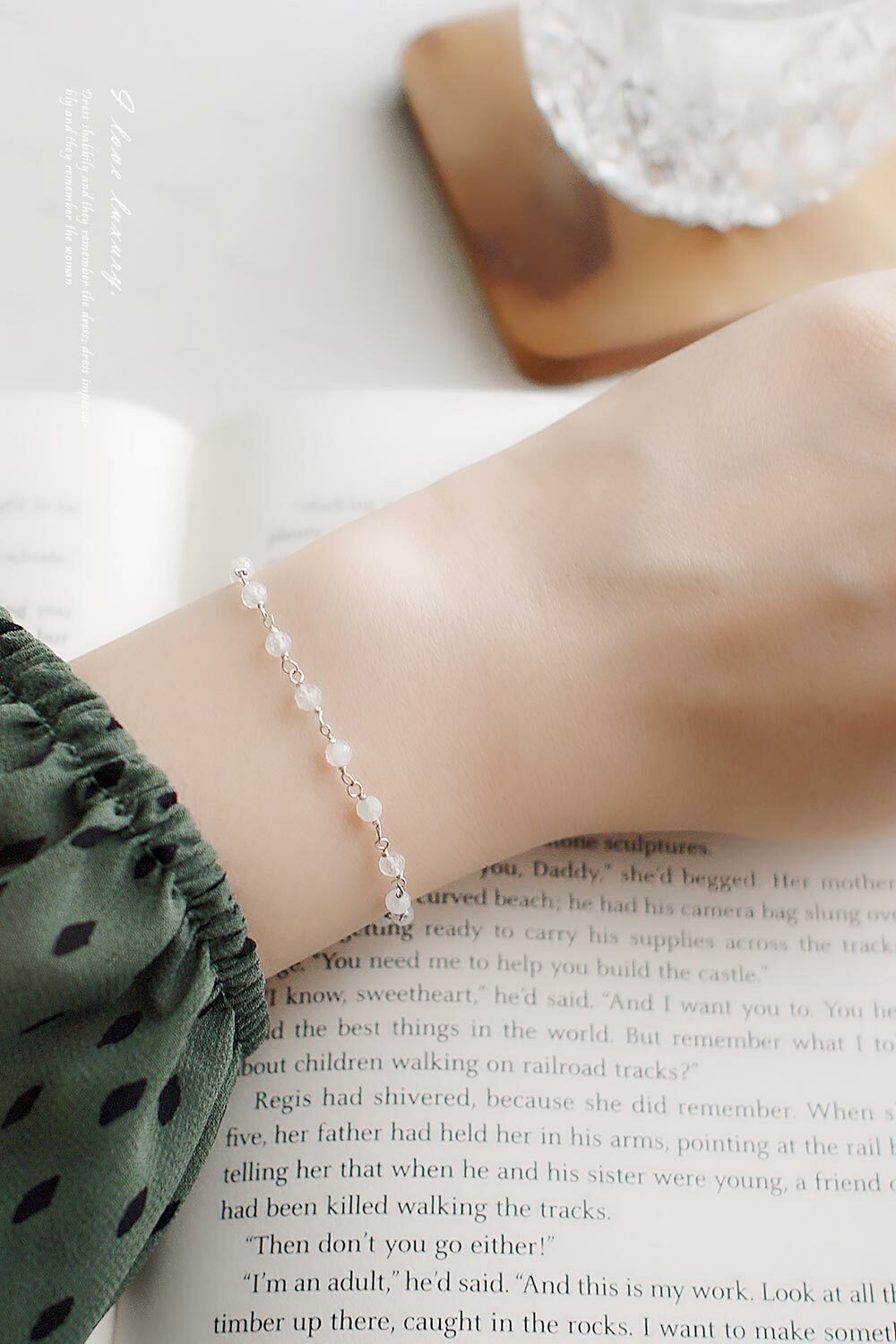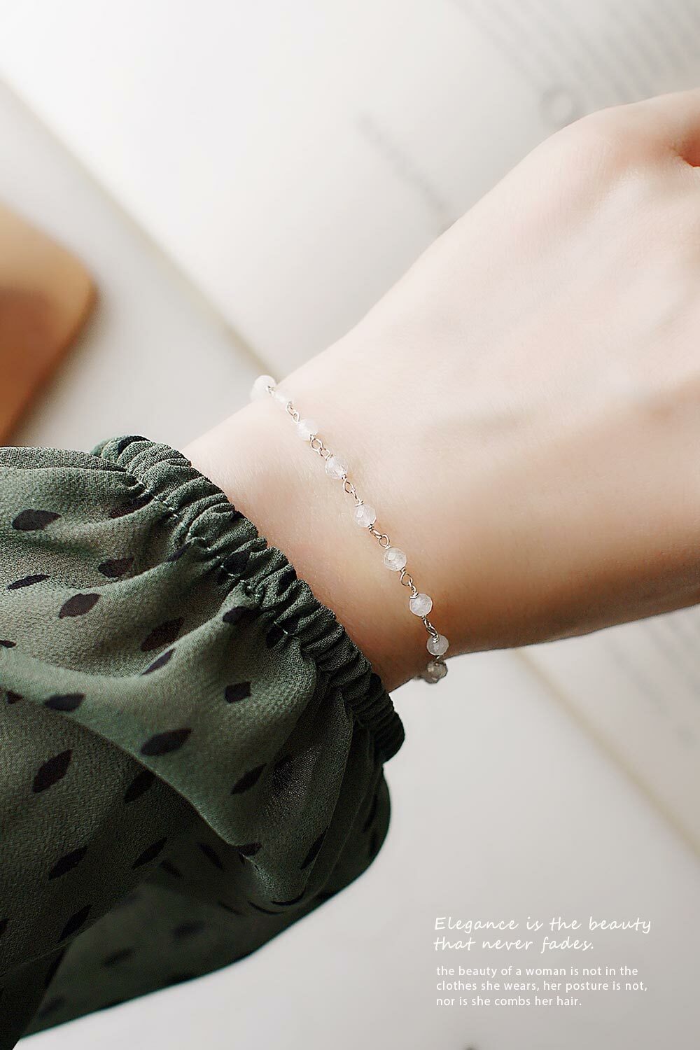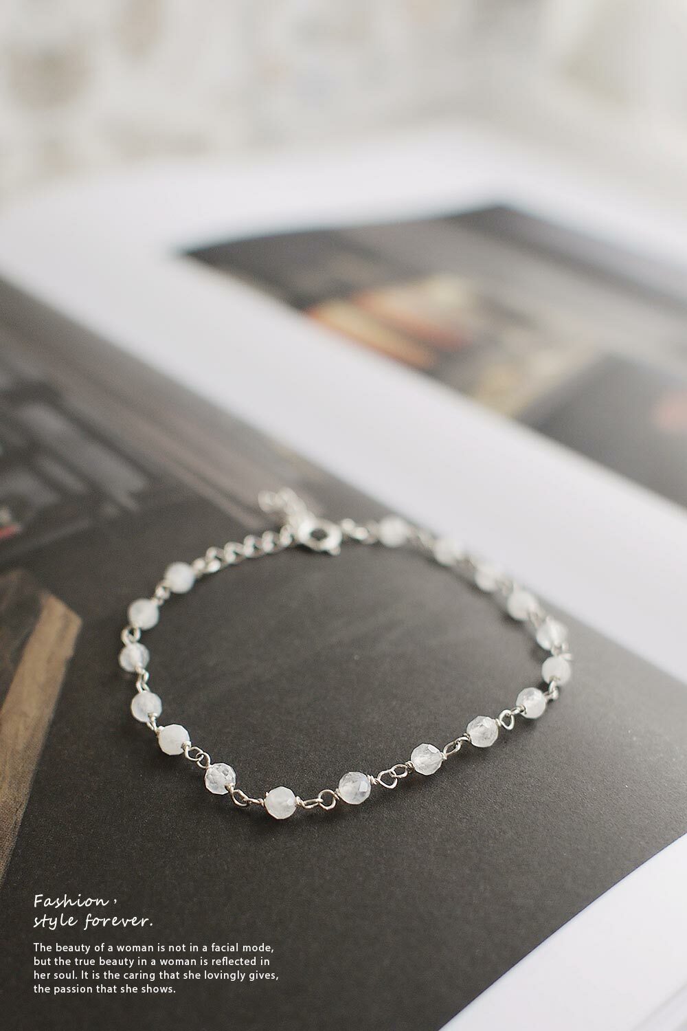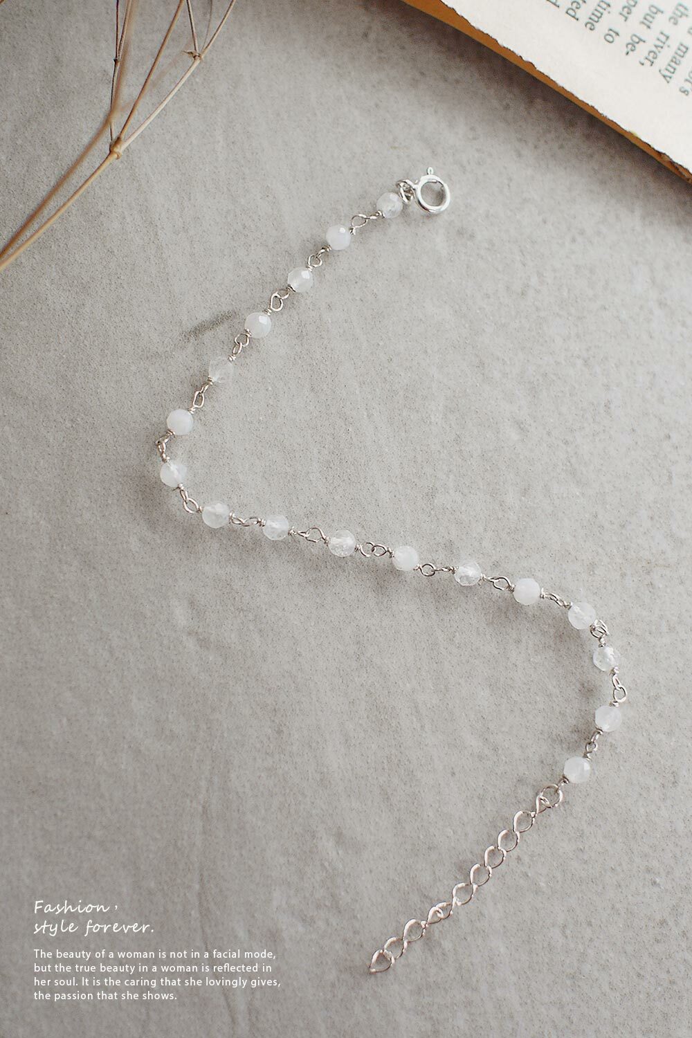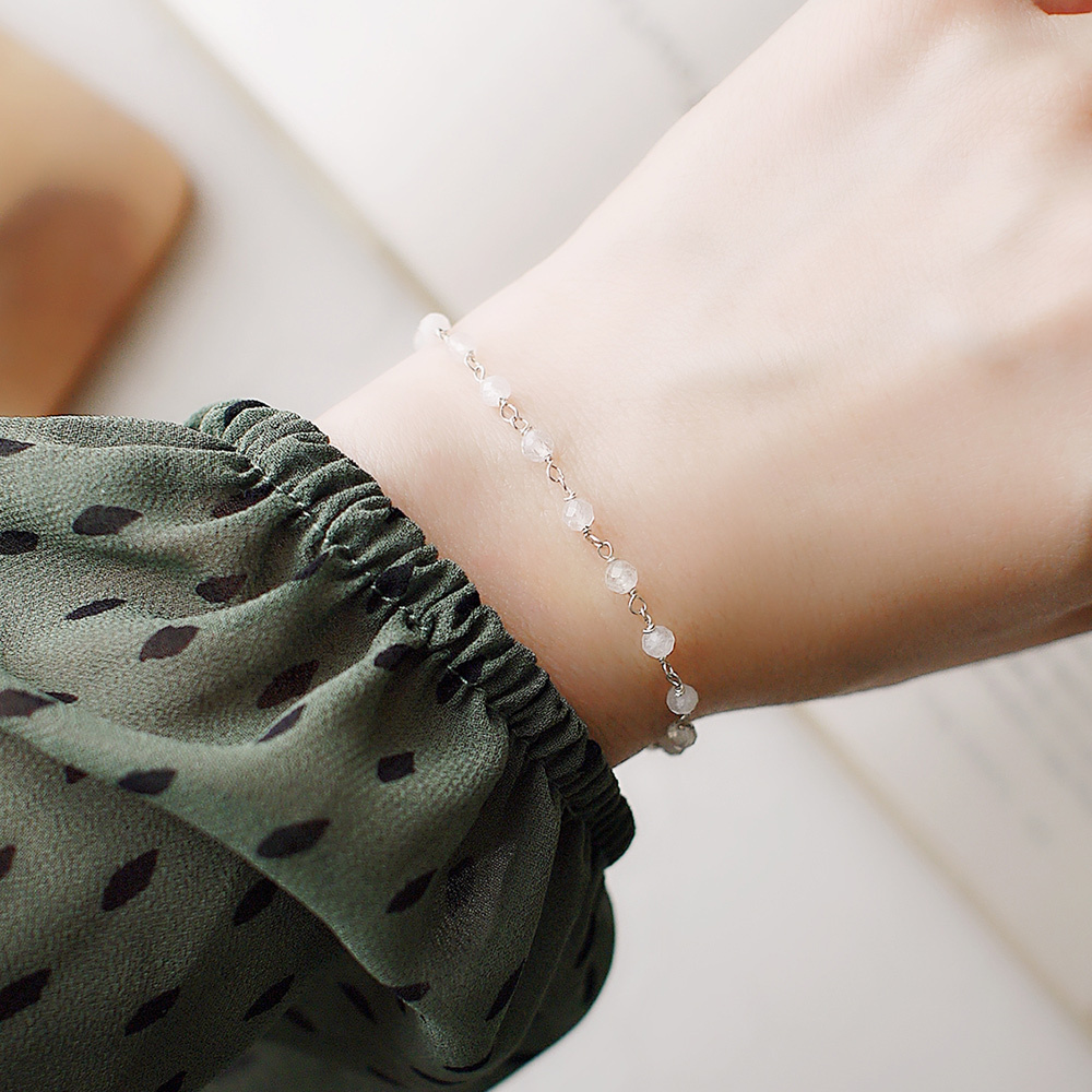 以18顆小顆月光石串成,帶有不同的折光,石頭深淺有別,因此手鍊有層次感。