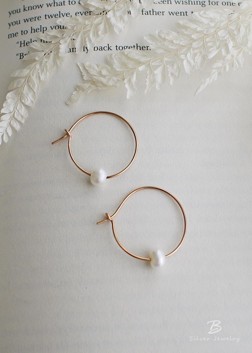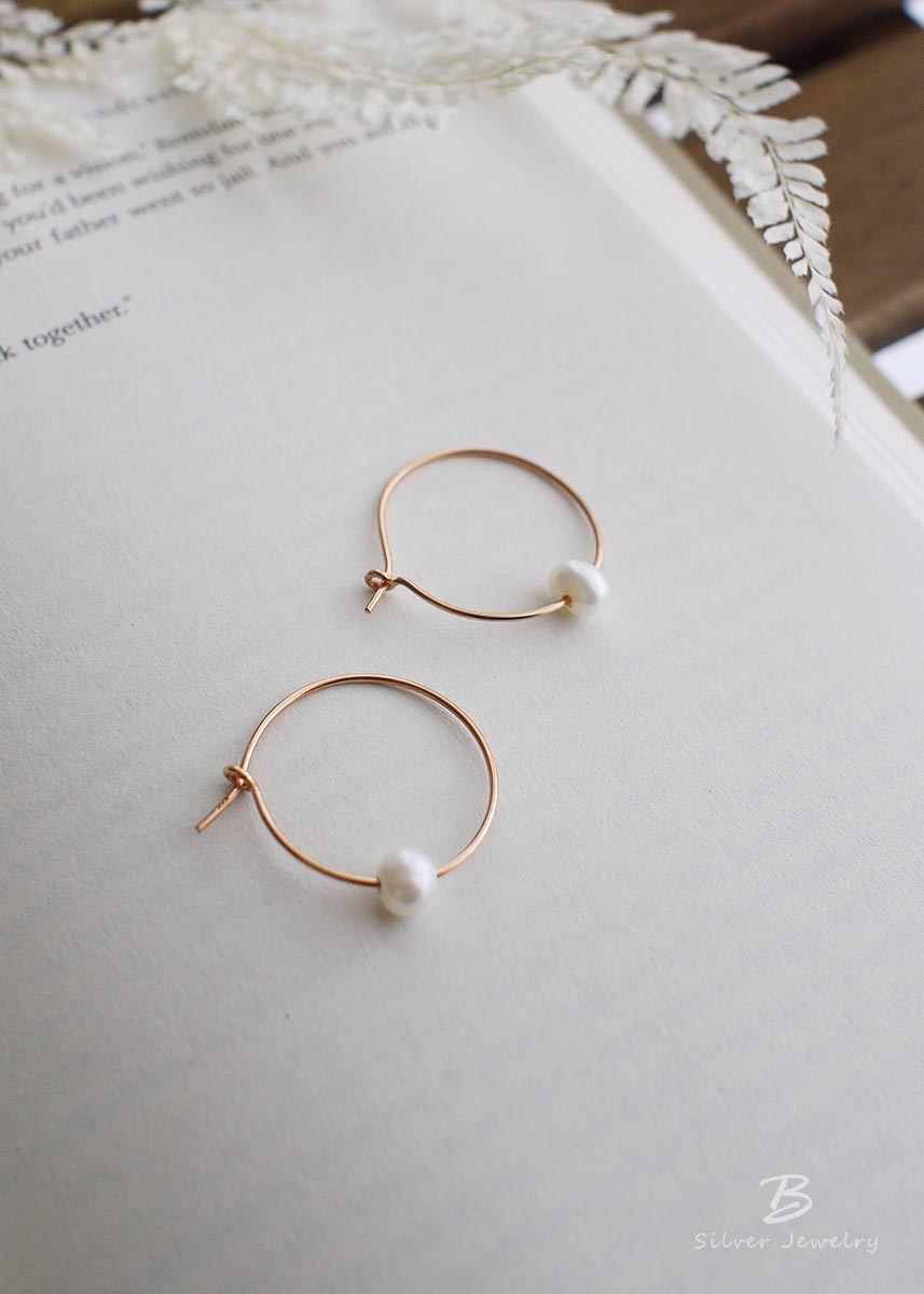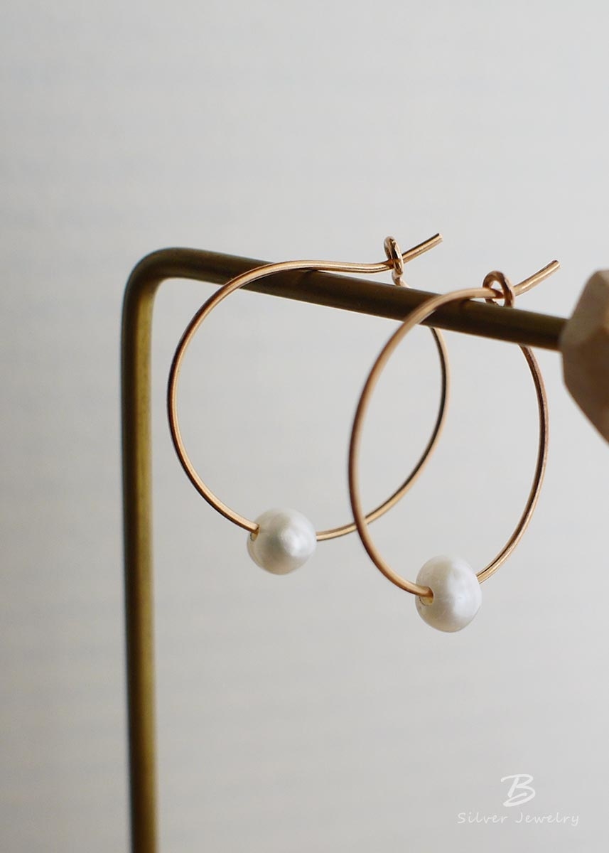 925純銀鍍玫瑰金耳環,以白色不規則淡水珍珠點綴,簡單有設計感。