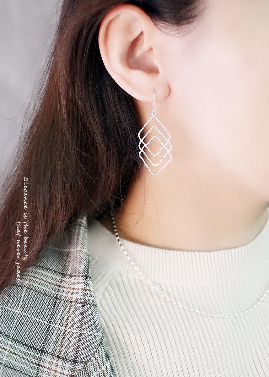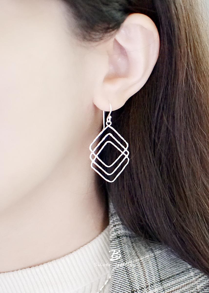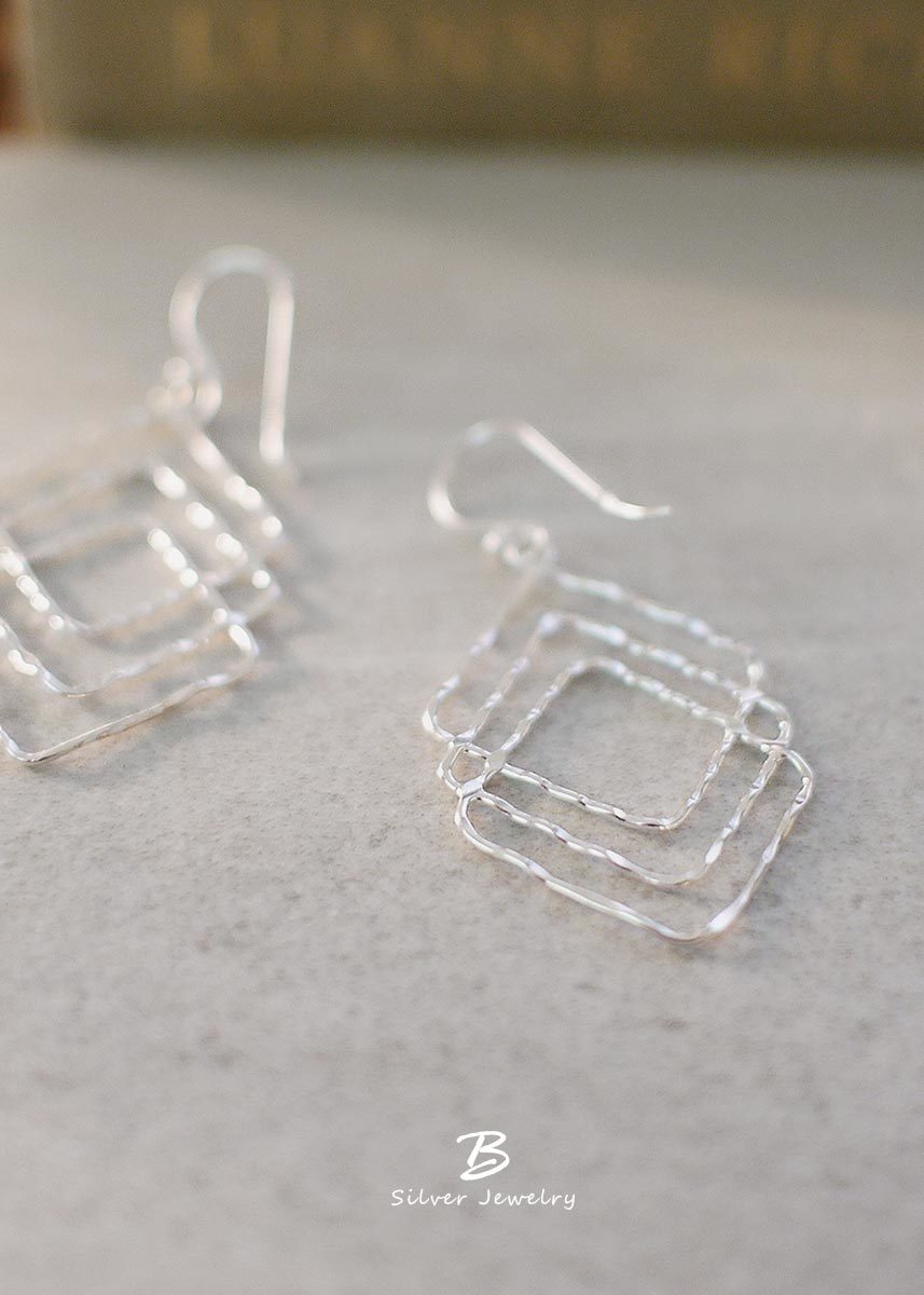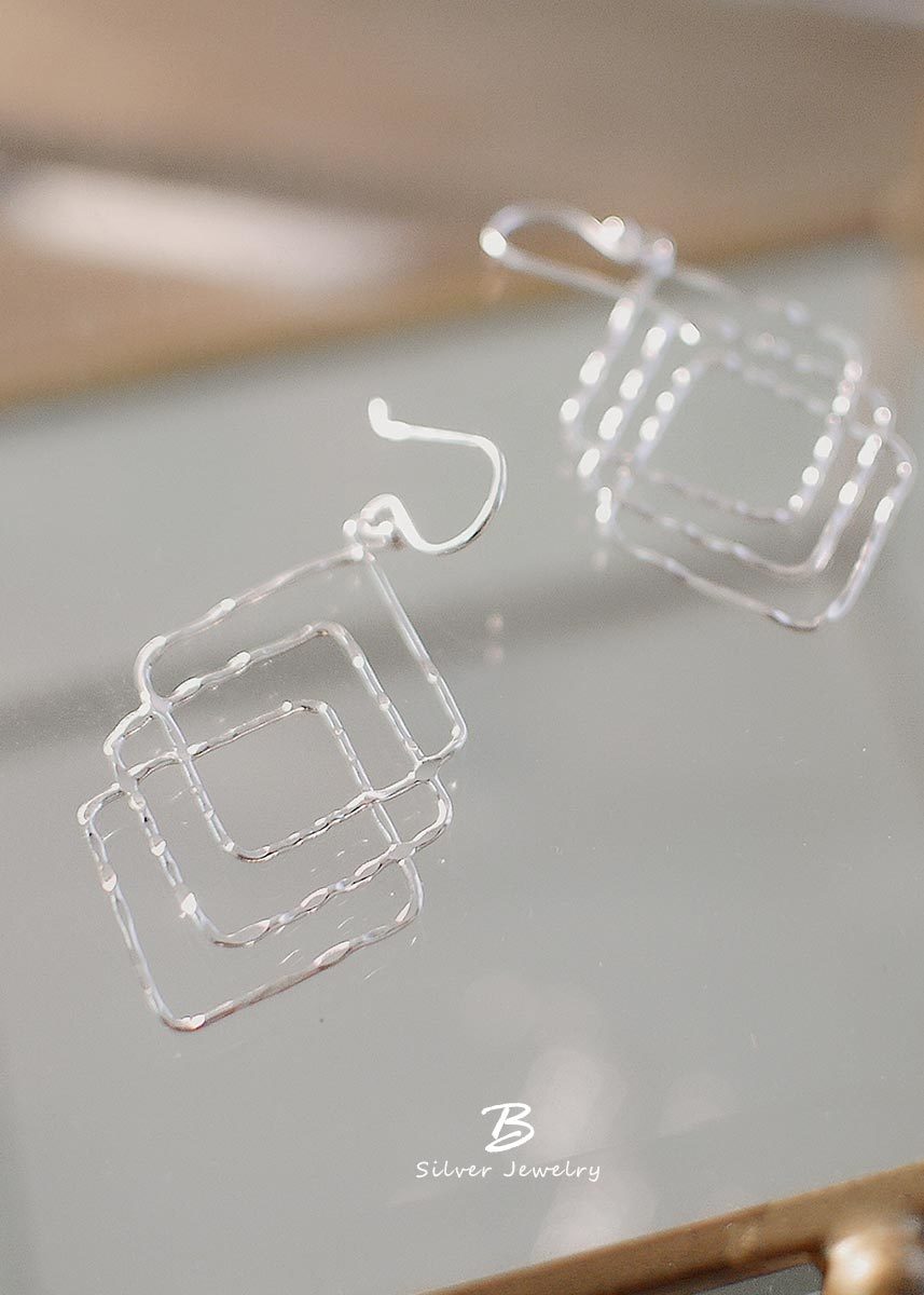 925純銀材質,以三個菱形組合而成,表面以手工鍛敲出凹凸質感,讓耳環展現自然溫潤的光澤。