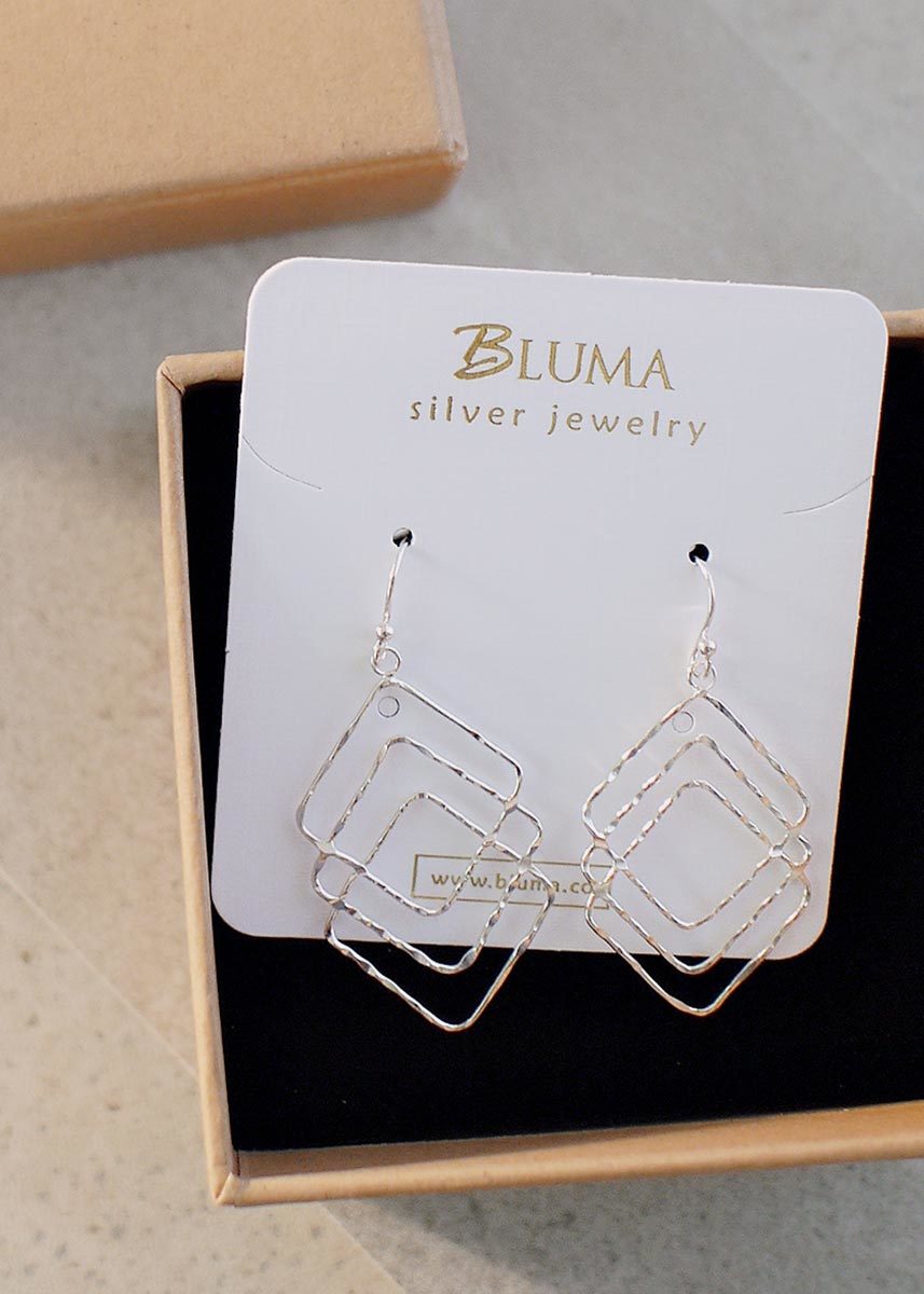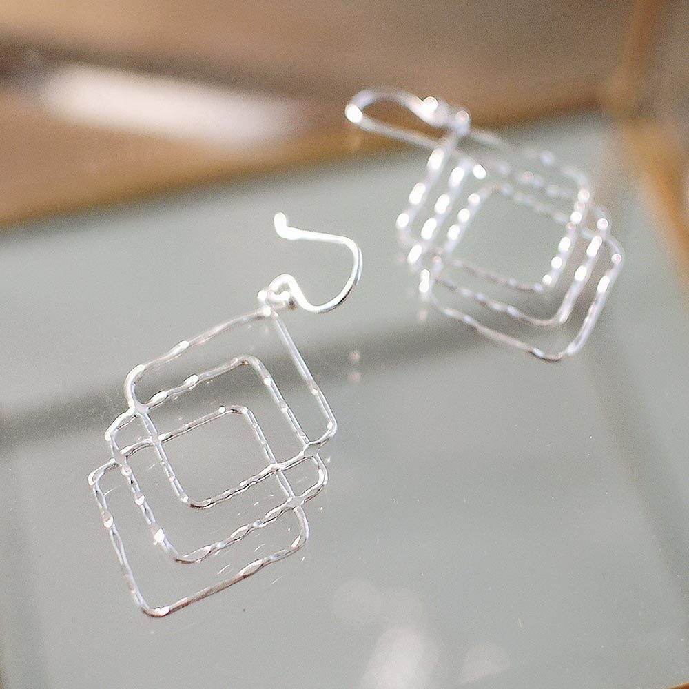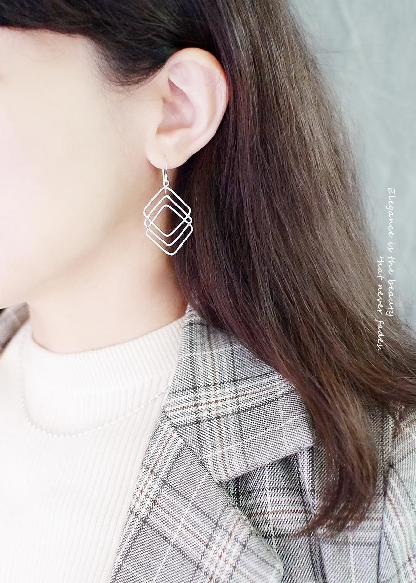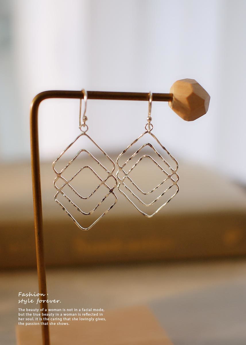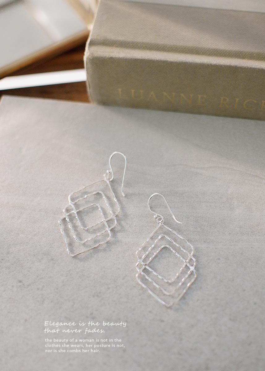 925純銀材質,以三個菱形組合而成,表面以手工鍛敲出凹凸質感,讓耳環展現自然溫潤的光澤。