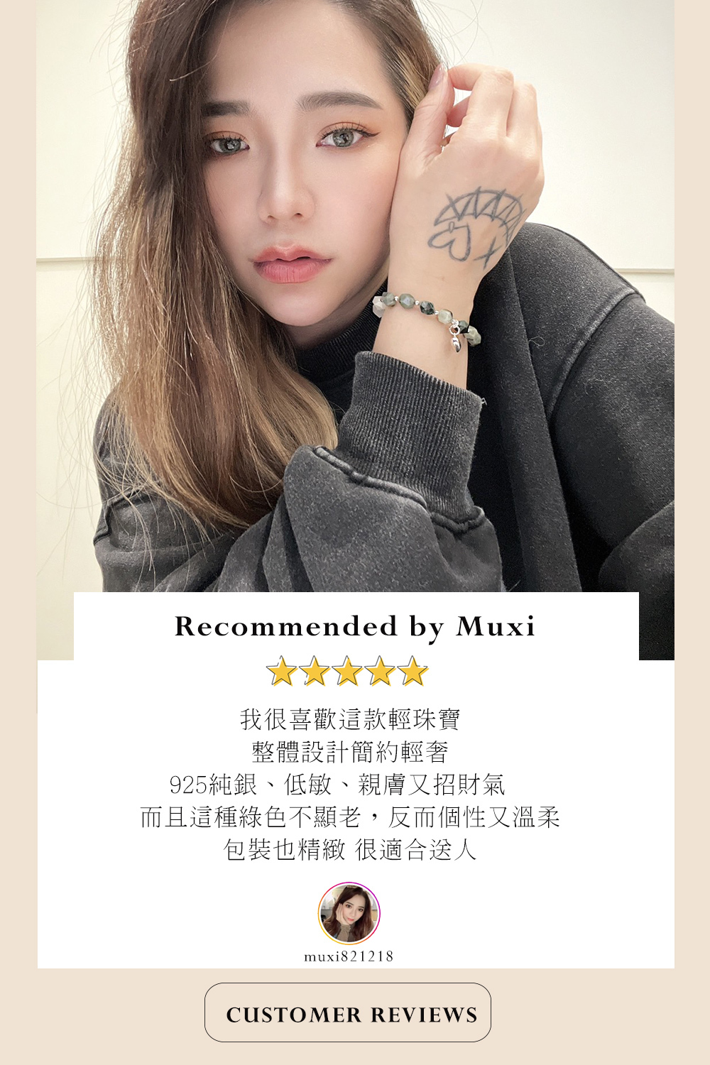 採用切面的天然水晶搭配925純銀珠,戴起來優雅不失個性,搭配西裝外套或皮外套自然且率性。