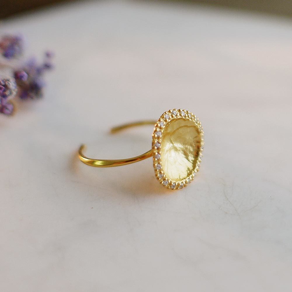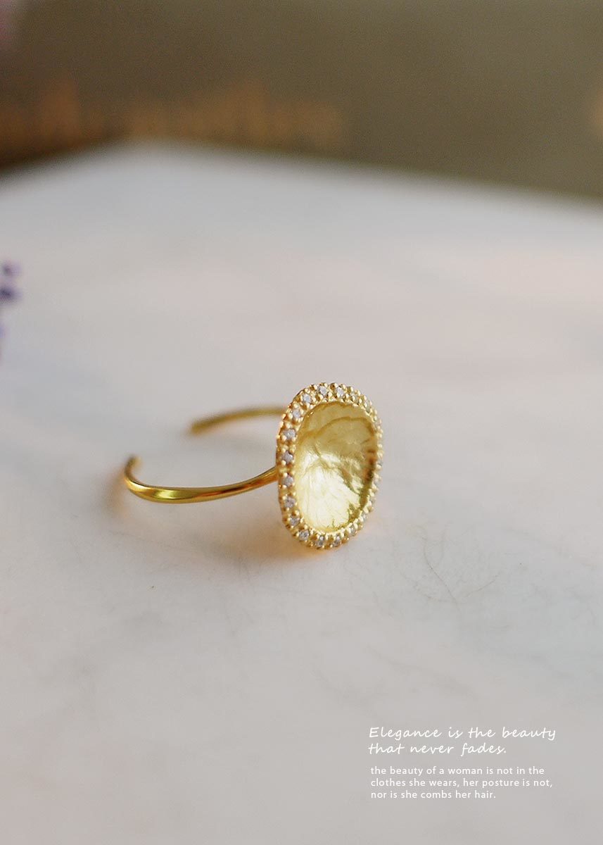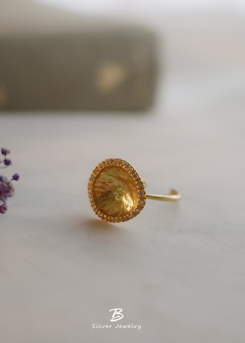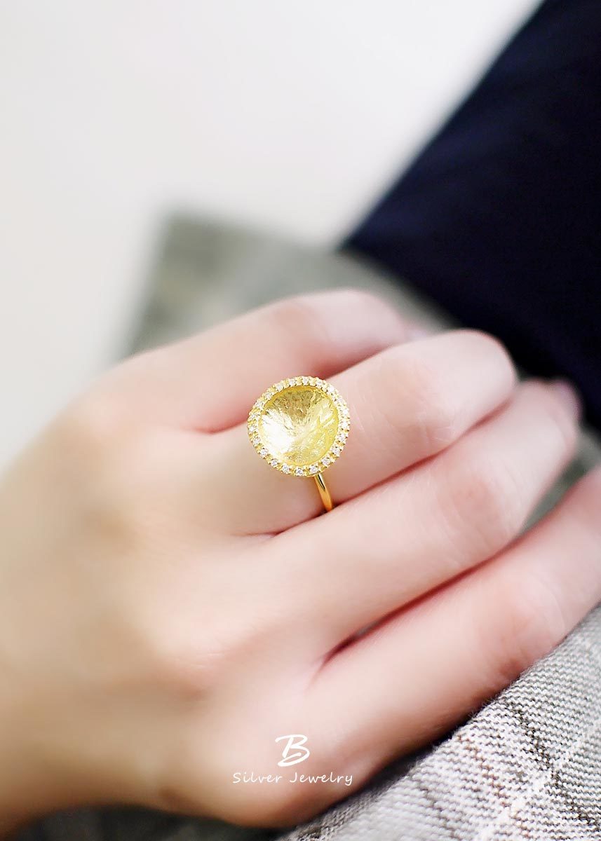 彷彿藝術品般的925純銀鍍18k金戒指,外圈以細密鋯石點綴,在優雅柔和的質感中綻放光芒。