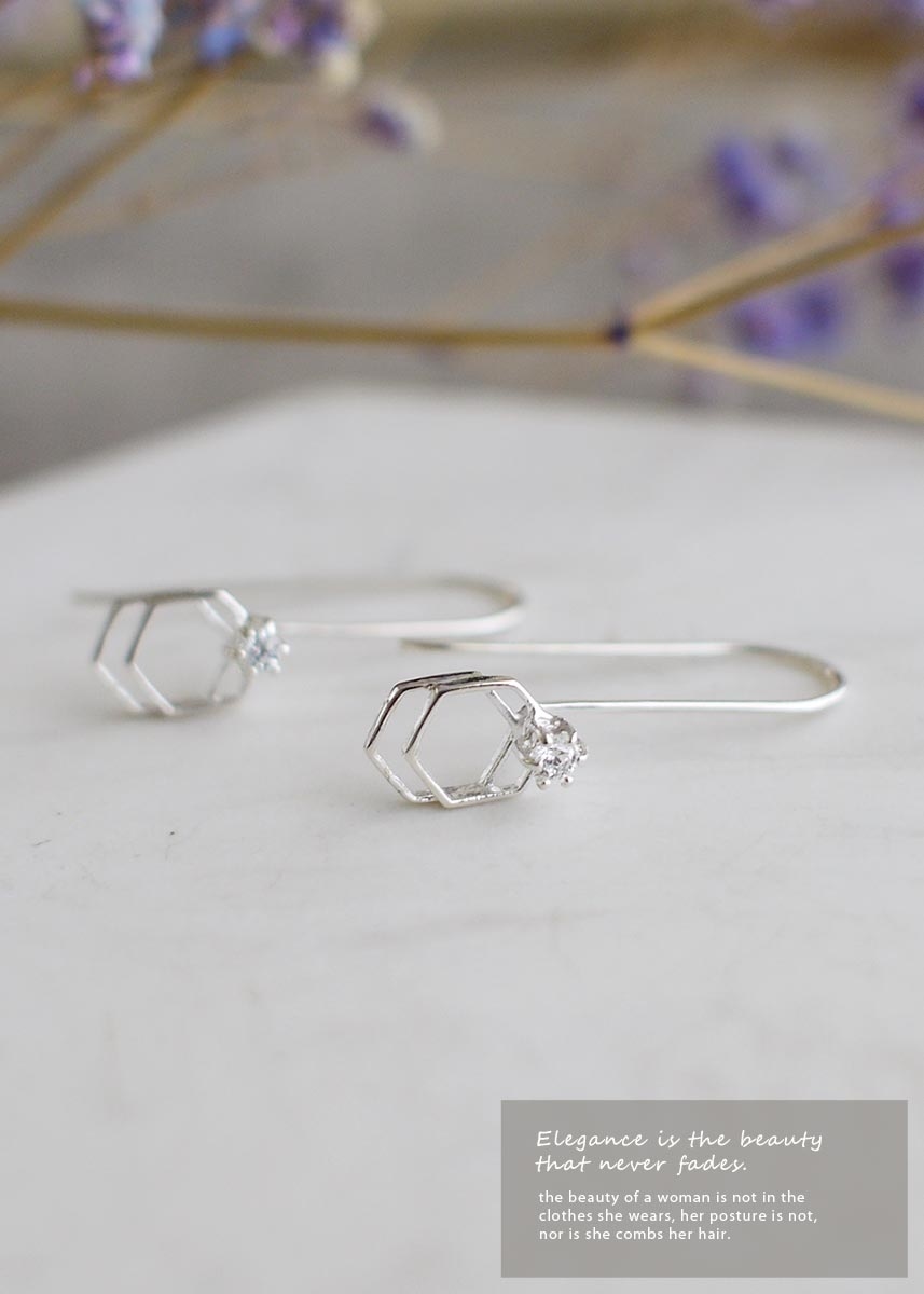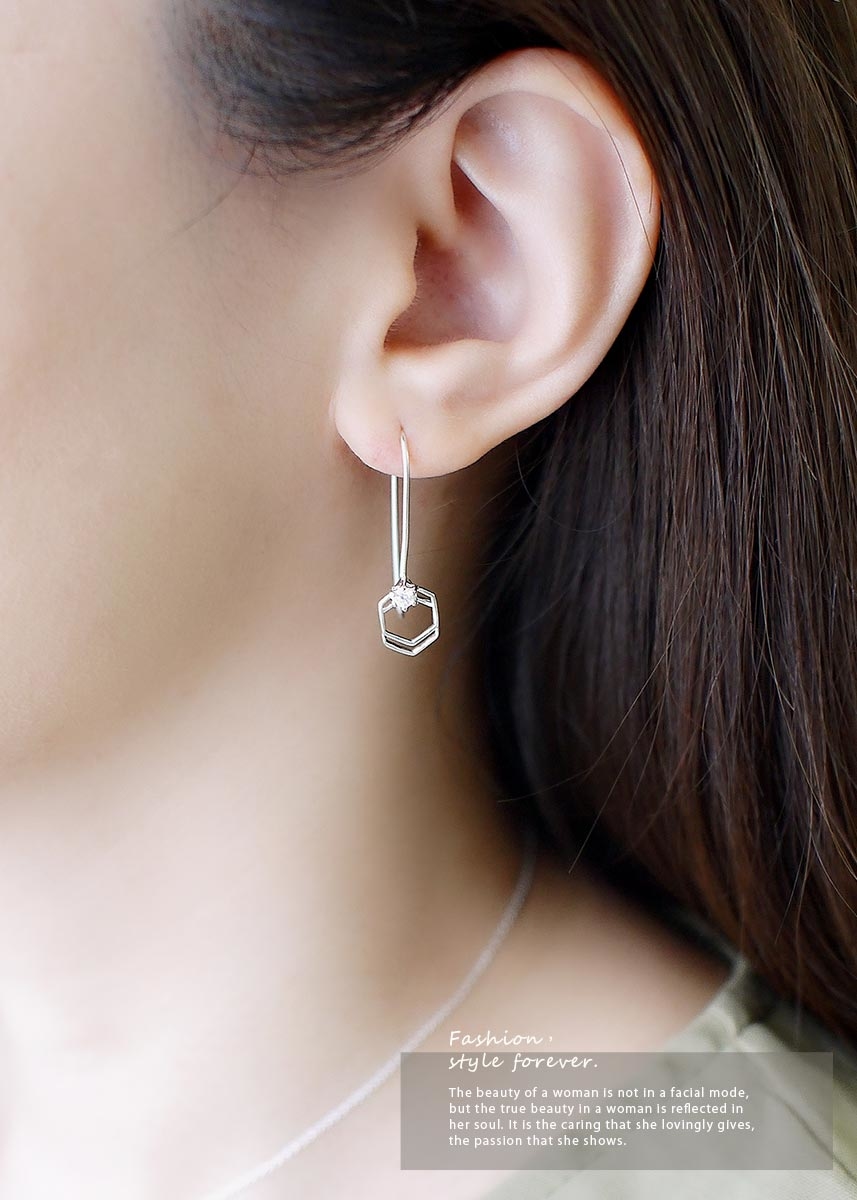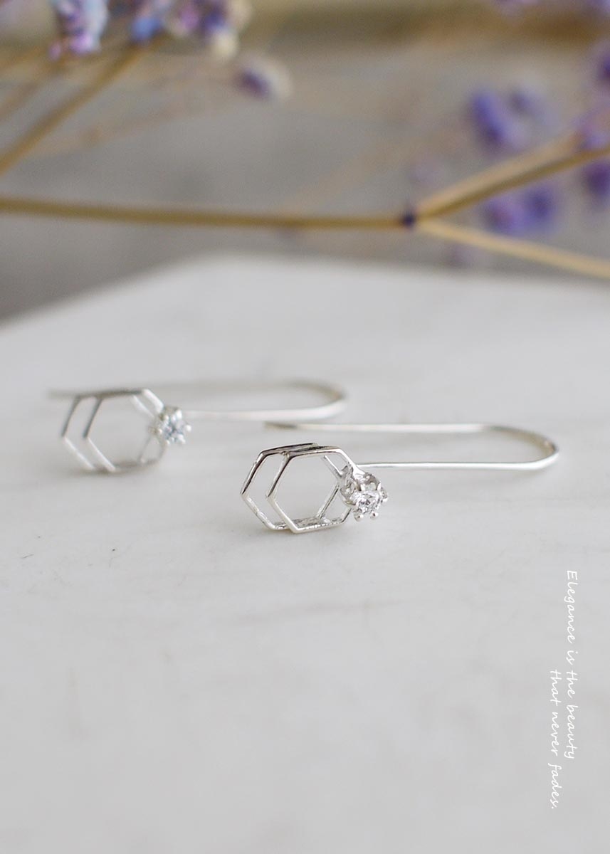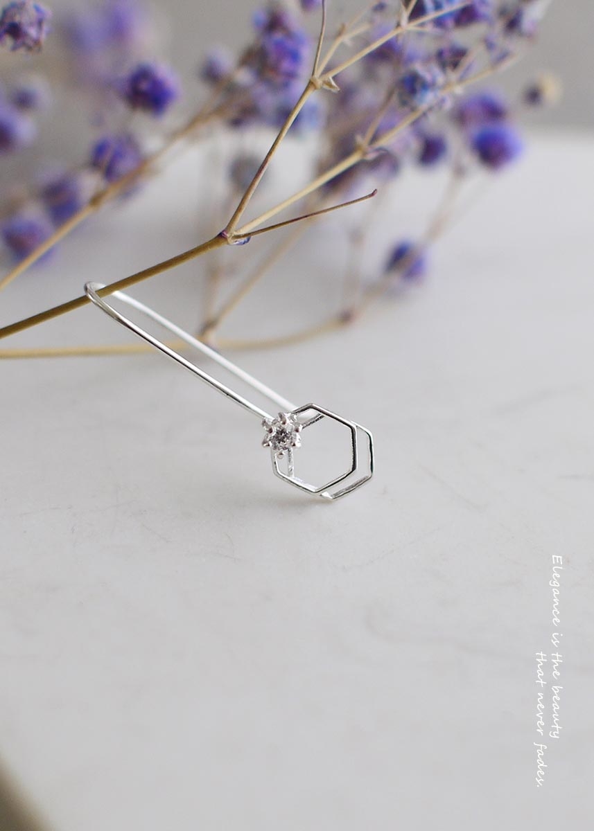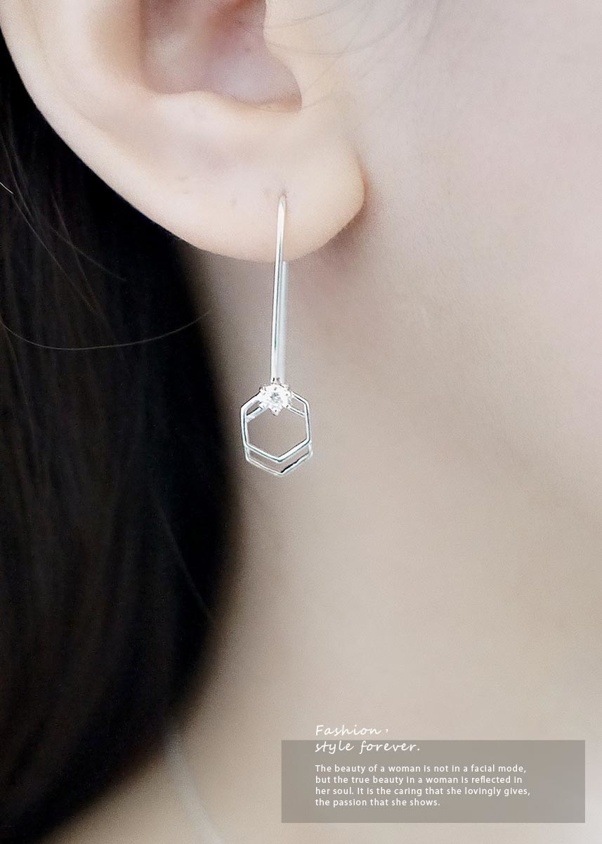 925純銀長型耳勾,細緻的雙層鏤空六角形鑲嵌白色鋯石,勾勒高貴優雅線條,個性不失女人味。
