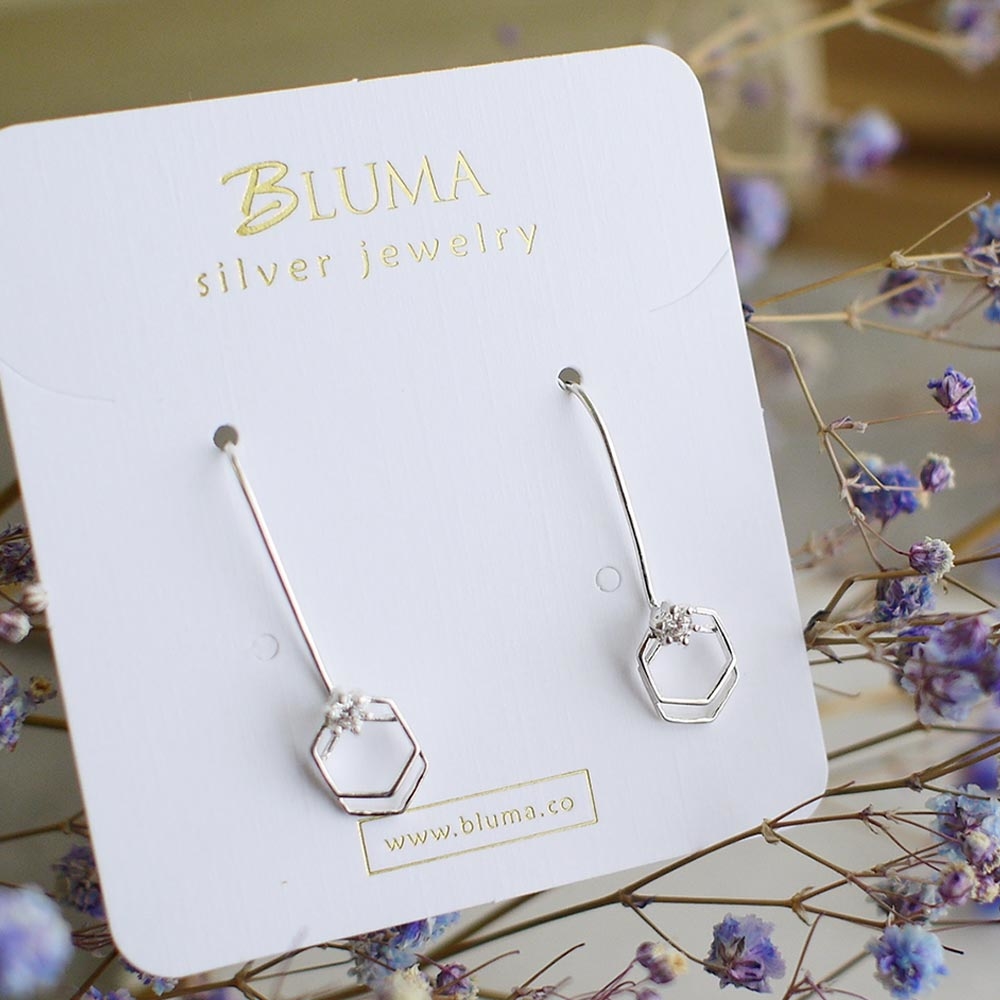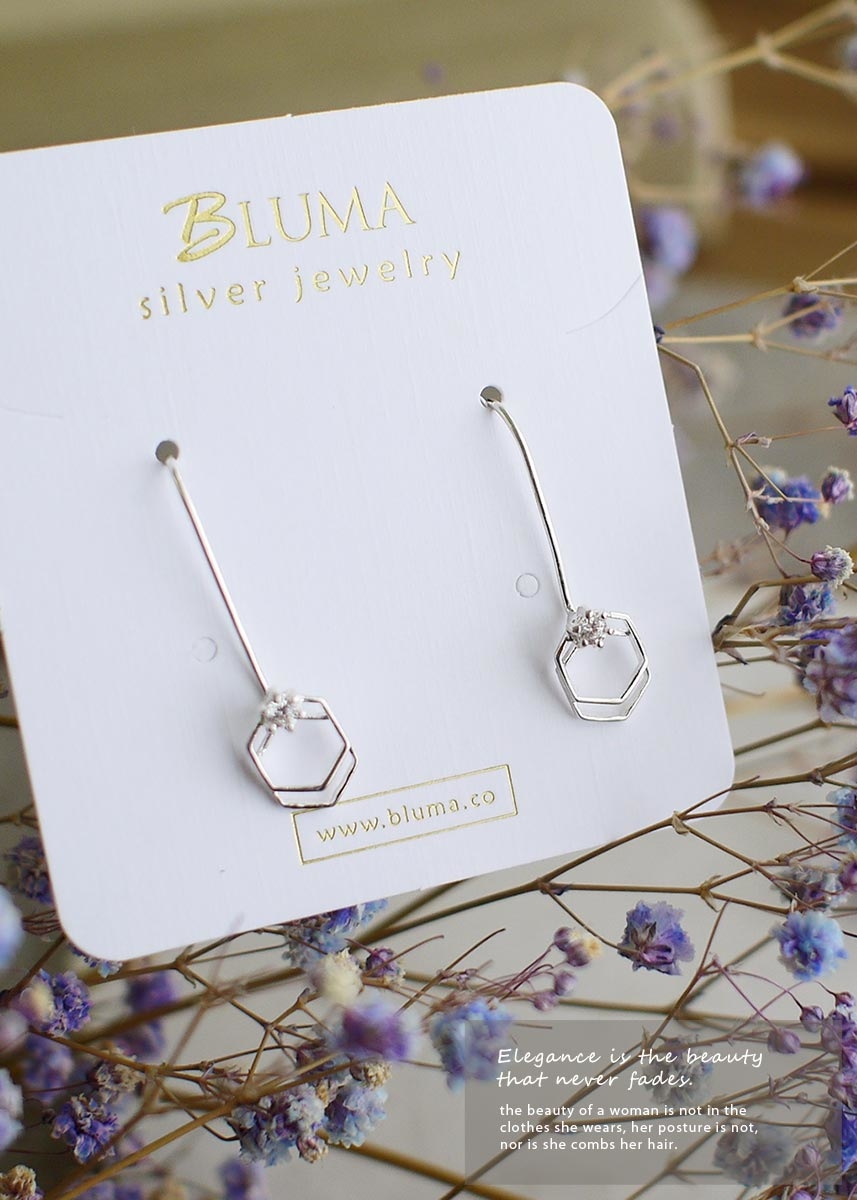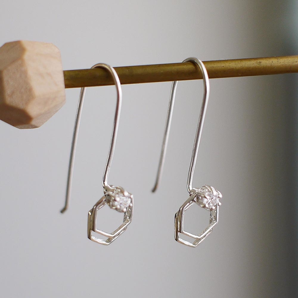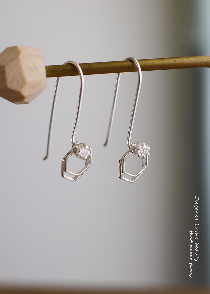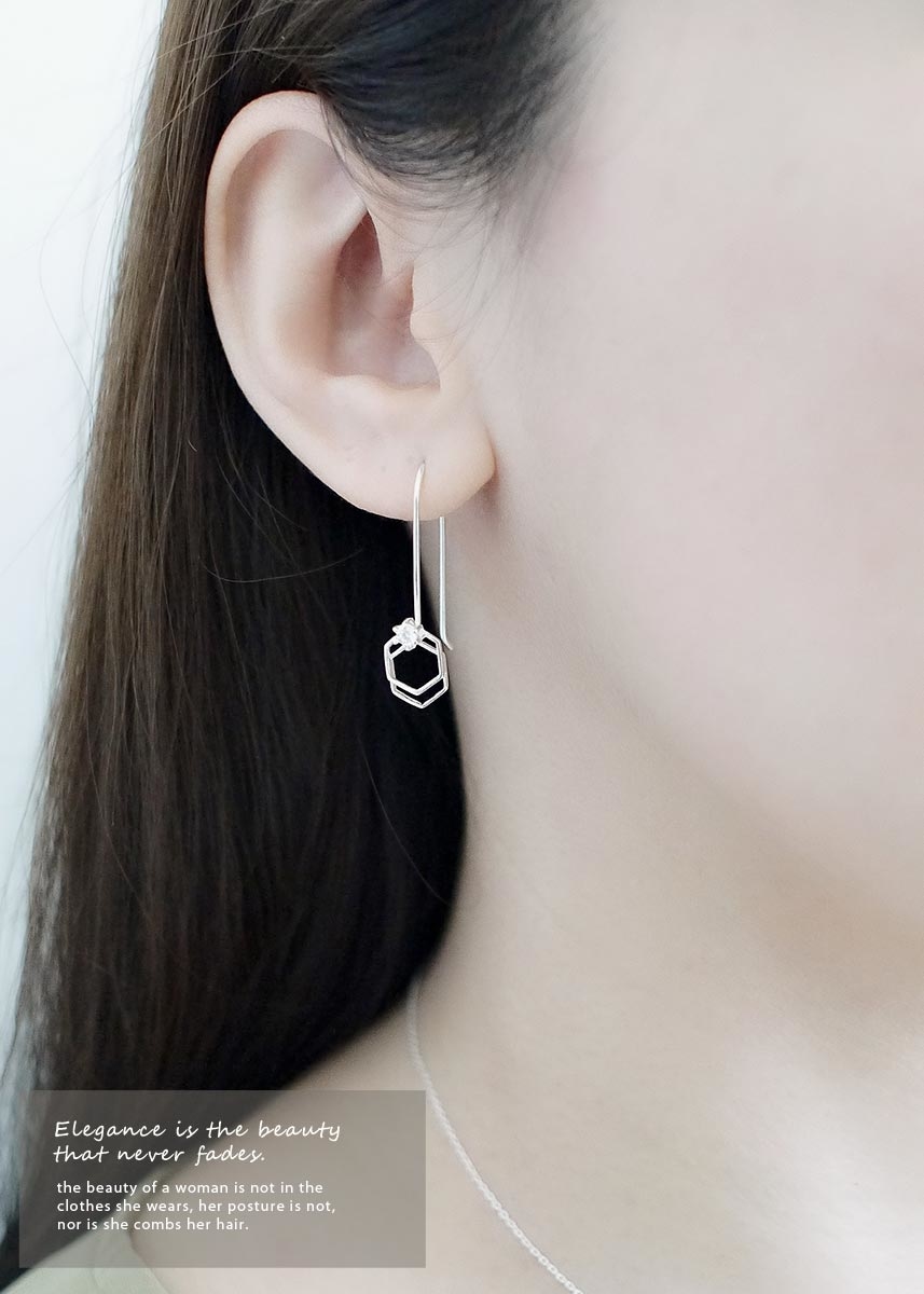 925純銀長型耳勾,細緻的雙層鏤空六角形鑲嵌白色鋯石,勾勒高貴優雅線條,個性不失女人味。