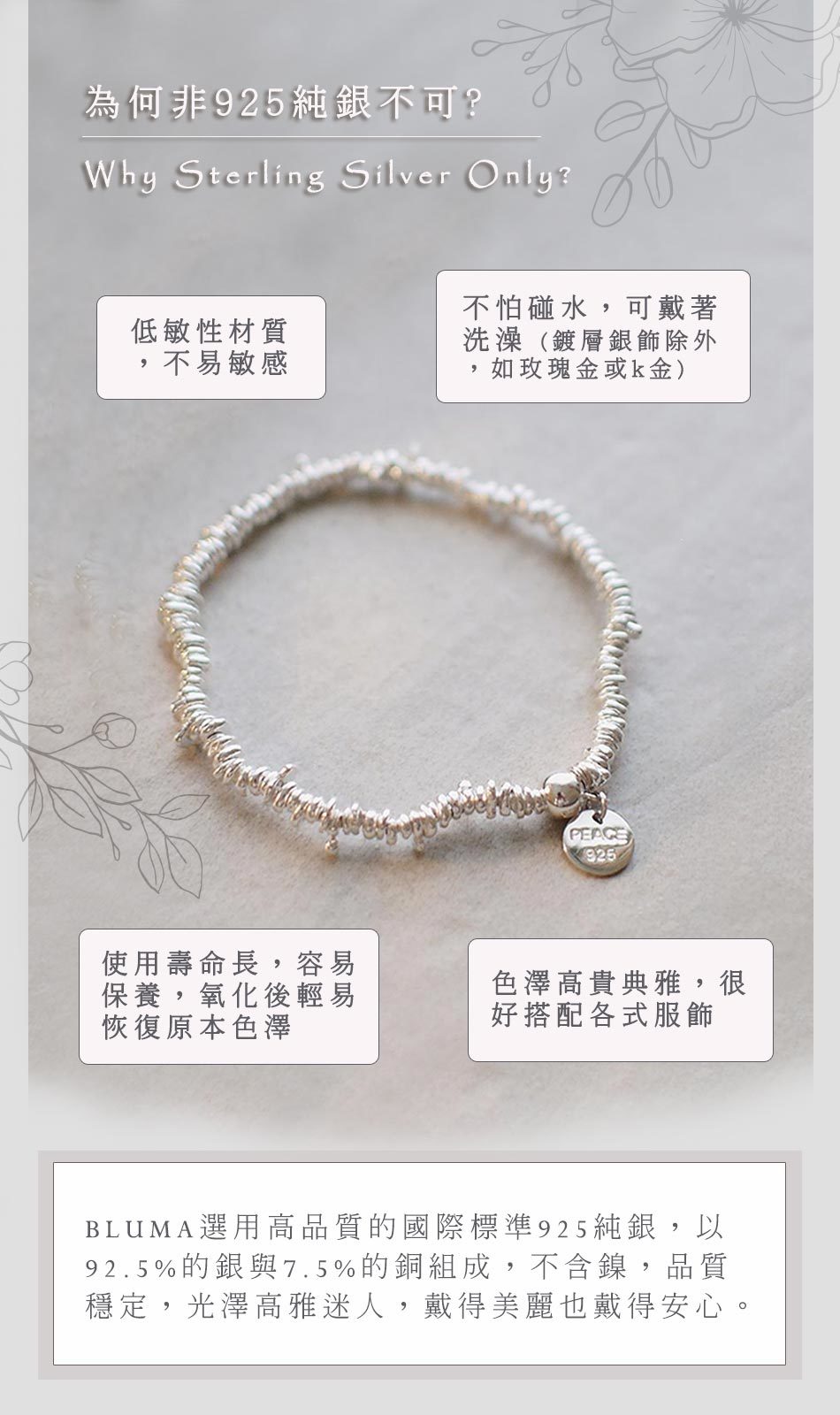 • 低敏性925純銀,不怕碰水、不會掉色。